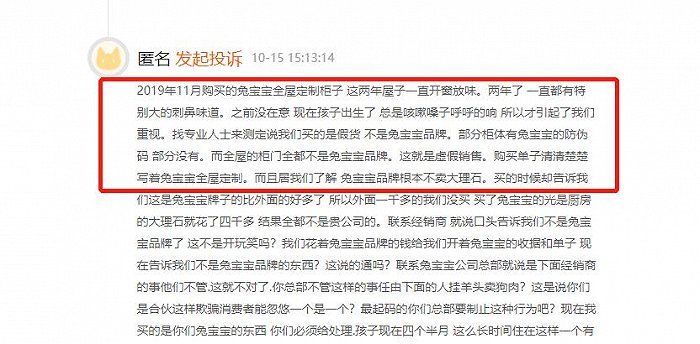 据一位消费者投诉称,自己花费41000元在兔宝宝全屋定制店定制了柜体,两年了仍有非常刺鼻的气味,于是找专业人士鉴定却发现部分柜子、木门都不是兔宝宝品牌,但购买清单却写着兔宝宝品牌。