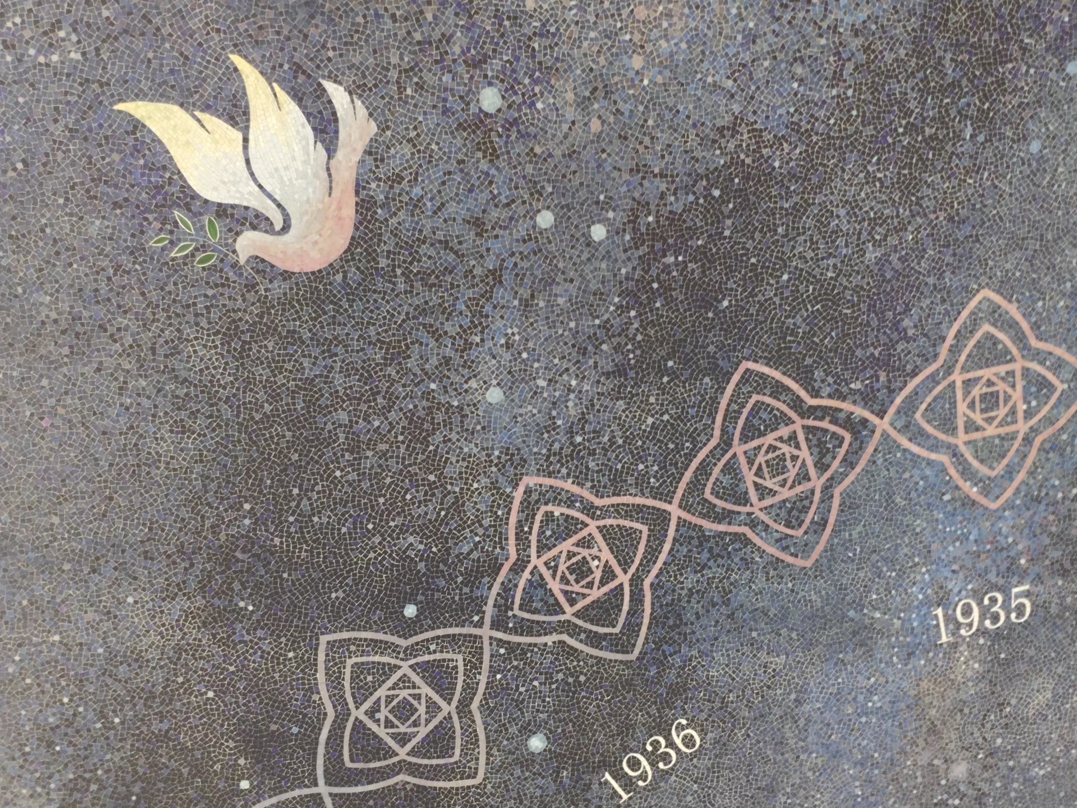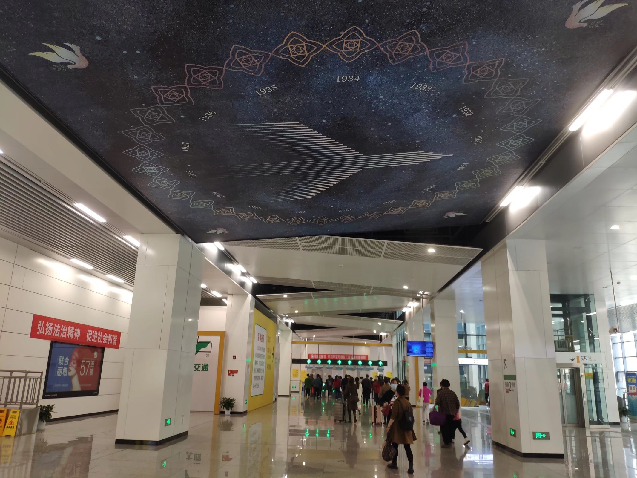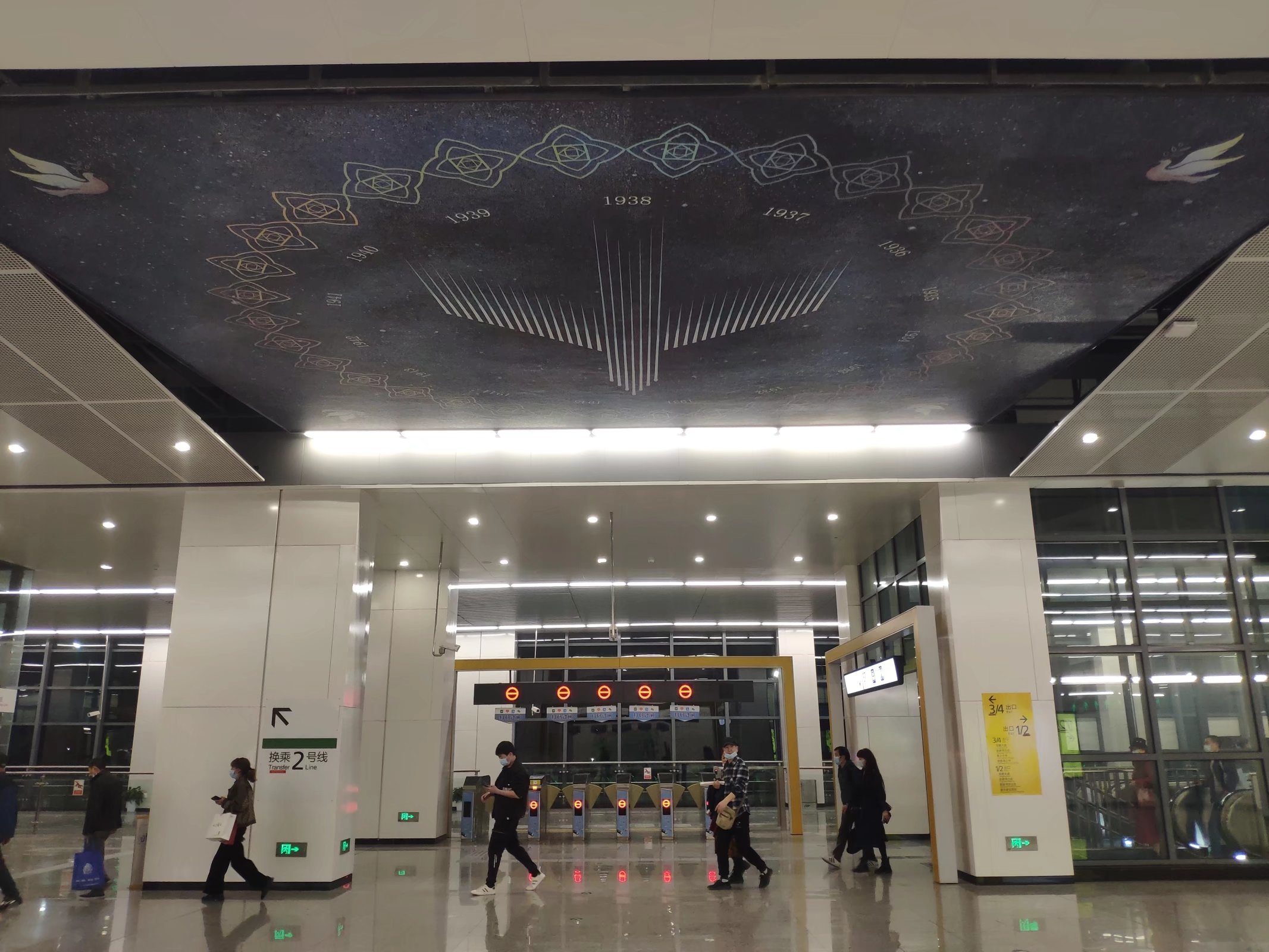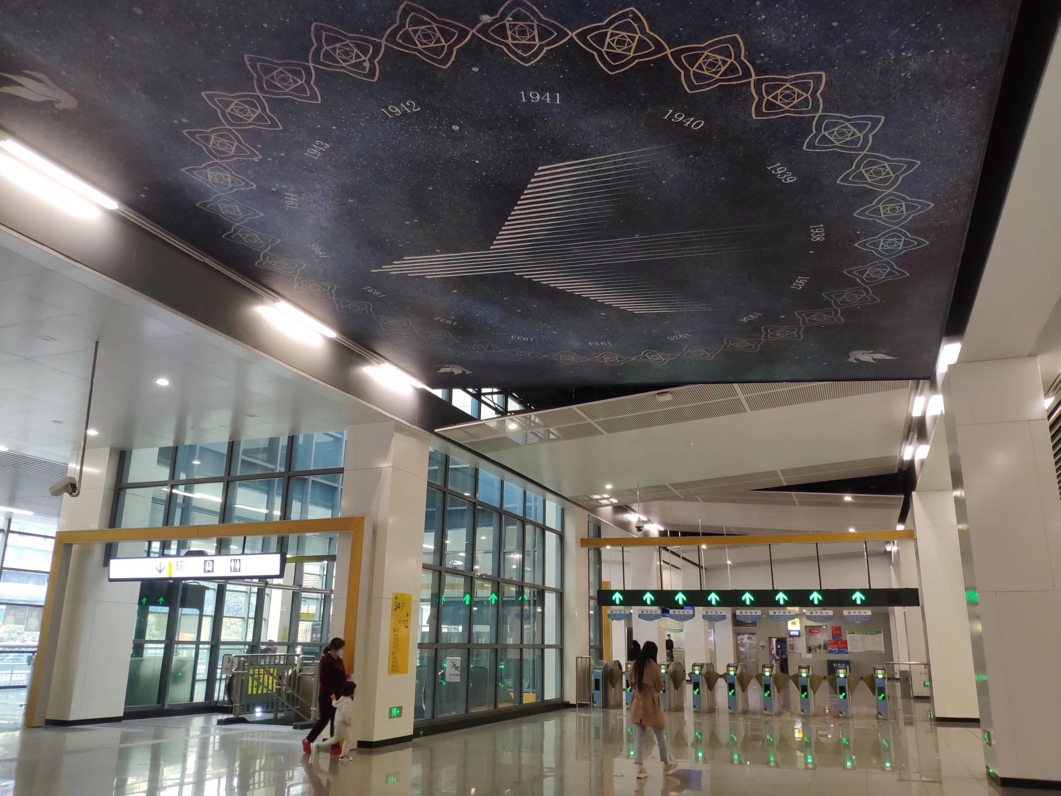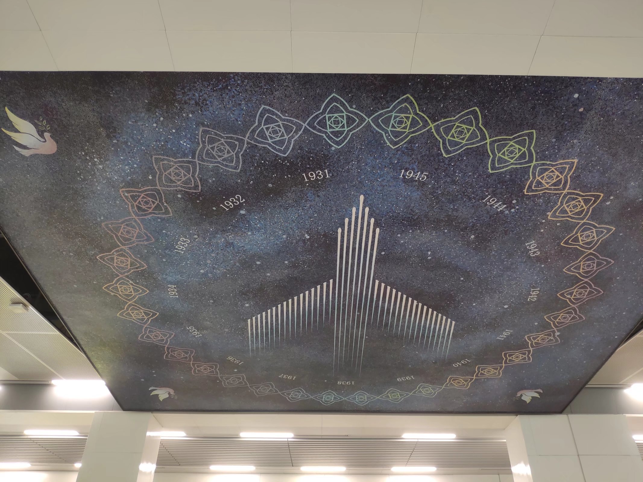 当人们匆忙路过这里时,希望头顶的“星空”能给他们带来一些轻松的氛围。当然,如果你停下脚步仔细欣赏这件作品,你会发现它有很多精妙之处。 在画面正中,几十道流星划过组成了一个飞机的画面。飞机周围是一圈代表年份的数字组合,从1931年一直到1945年。 再往外是一个用图案组成的花环。