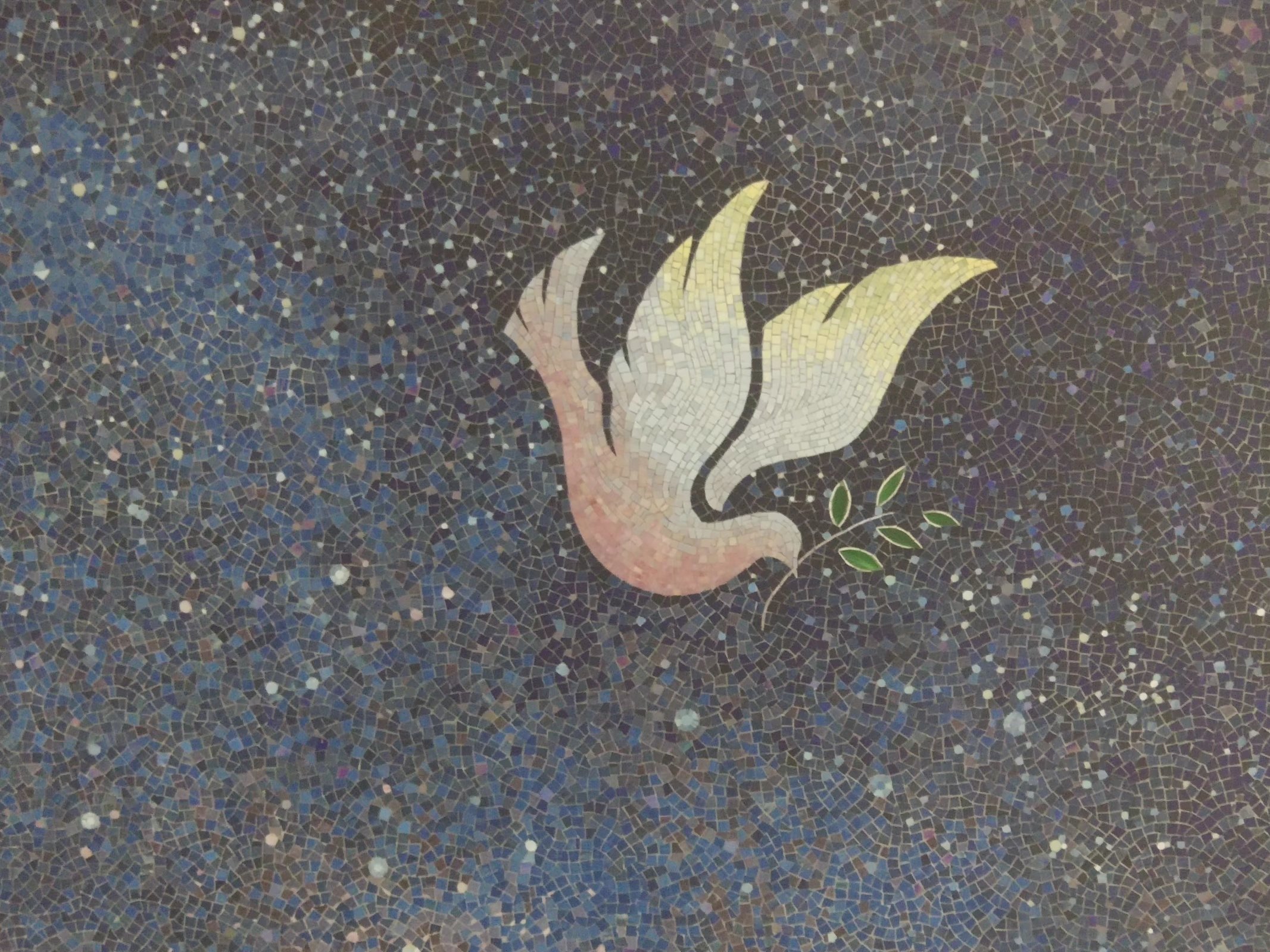 在作品的四个角上,还各有一只衔着橄榄枝的和平鸽。这件作品被命名为“和平之宇”,因为谢家湾站紧邻重庆建川博物馆,所以作品以抗战文化和重庆大轰炸为创作灵感,在打造“星空”的同时,也寓意着和平。 更妙的是,这件作品虽然采用了壁画常见的马赛克拼贴手法,但是马赛克的单块面积却只有2.25平方厘米(1.5厘米×1.5厘米)。