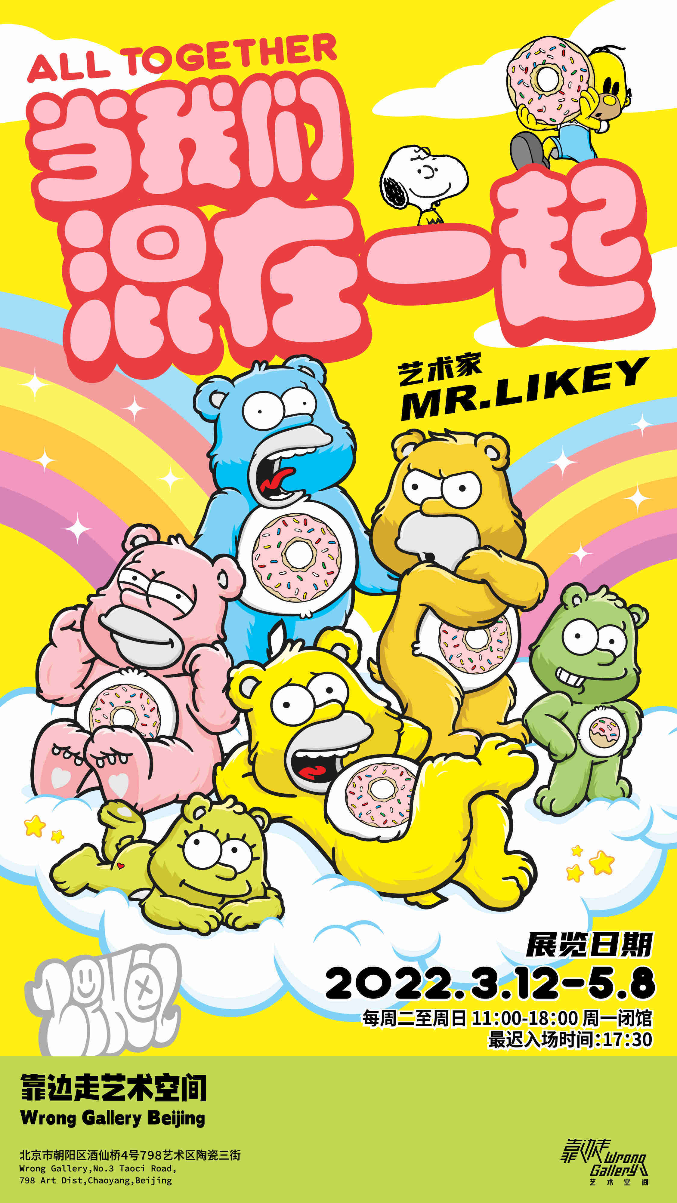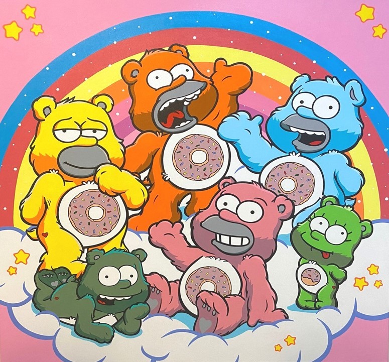生于中国香港的Mr.Likey,自小便跟随家人移民美国。他笑称每天放学后看动画片也是一门必修课,这也影响了日后他的艺术风格。Mr.Likey擅长把经典的卡通形象和文化符号解构再重构,融合出有趣的画面。靠边走艺术空间把这些带有街头艺术美学的作品按照内容划分了四个主题展区。熟悉的卡通形象如辛普森一家、彩虹小熊和史努比在艺术家的笔下被颠覆性的再现。穿行其中,观众最初或许会产生一种“似是而非”的困惑,继而去寻找画作中隐藏的信息,仿佛在玩解密游戏一般,而最终会对这些元素颠覆性的重构和背后隐含的艺术脉络会心一笑。而画作的隐喻?这又是另一场作者与观众间的游戏了。