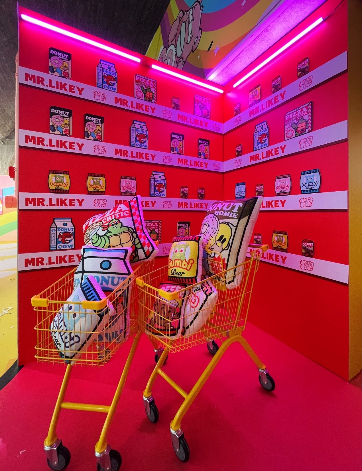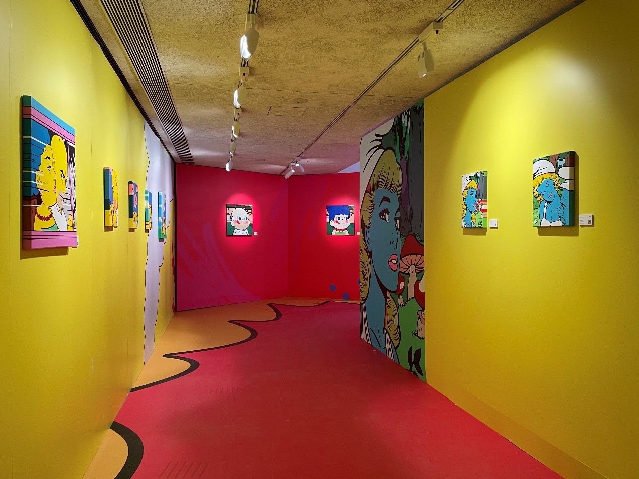“融合”这一概念不只出现在艺术家的画作中,实际上,整个展览空间都充分阐释了“融合”理念。步入展厅的瞬间,高饱和度的、明亮的色彩在墙面和地面上撞击,给人以爆炸般的视觉刺激,提醒你已进入迷幻的波普世界。超市货架、社区泳池、街头篮球场,这些街头艺术作品中的重要元素在展厅里立体呈现,让你仿佛置身于一幅经典的街头艺术画作当中。如果你在空间中看见一片甜甜圈森林,不用过分惊讶,因为甜甜圈也是“消费主义”的一个象征性符号,而消费主义与波普艺术有着千丝万缕的联系。看似与画面毫无干系,又各自独立的装置实际上来自于画作的映射,这些装置背后的意义也相互联结。如此展陈之下,每一位观众也都可以和作品产生深度的、独立的、独具个体象征意义的身体与精神的“融合”。