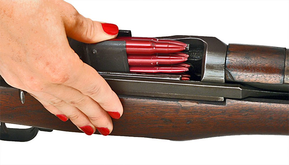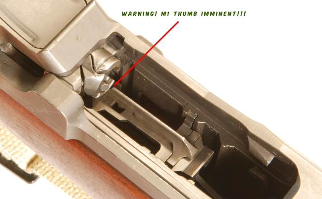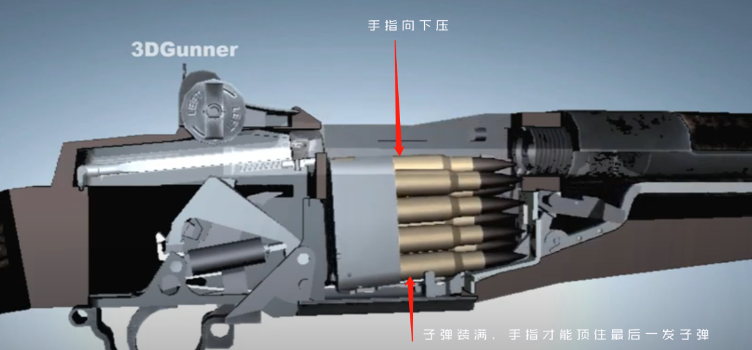 其实加兰德正确的装弹方式,首先保证空仓挂机到位,然后将漏夹塞进弹仓的时候,用手掌后部,顶在拉机柄上,这样可以延缓枪机复进的速度,就可以将夹手指的风险降低到最低了,通过大拇指将漏夹压下去,先收回大拇指,然后移开手。但是,如果手速够快,可以直接忽略。