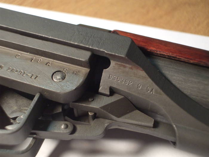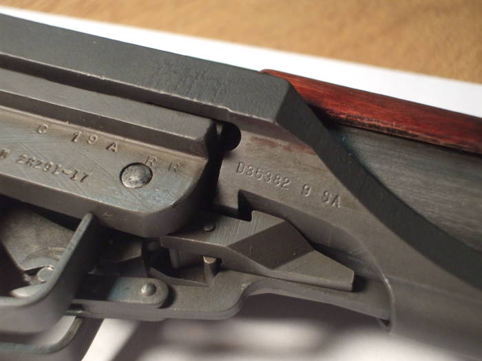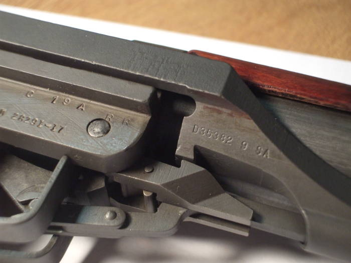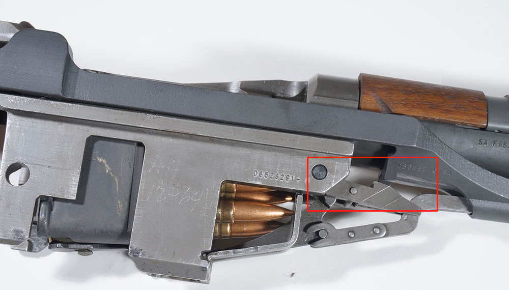 当空仓挂机状态时,弹夹从弹仓压入,托弹板向下压,连接的杠杆将空仓挂机杆向下压,这个时候,空仓挂机杆和枪机导杆解除连接。但是这会儿,由于有漏夹的存在,枪机是还是被漏夹顶着,无法复进的。当最后一枚子弹压进去的时候,枪机就能通过漏夹上的装弹口向前缓慢复进了。但是由于有手指压着子弹,子弹不动,枪机就不能动,子弹微动,枪机微动,松手,啪!