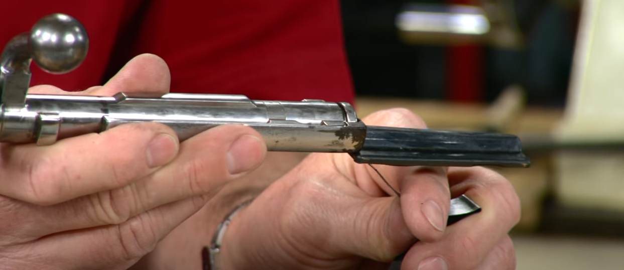 其实还有一种错误的空仓挂机方式也会导致夹手指。很多步枪是直接通过托弹板顶住枪机的,比如98K,就是通过托弹板完成挂机的。98K是栓动步枪,需要手动上弹,空仓挂机之后,会导致推不动拉机柄。但是很多人觉得这个设计蛮鸡肋的,干脆给托弹板磨出个角度,不要空仓挂机了。