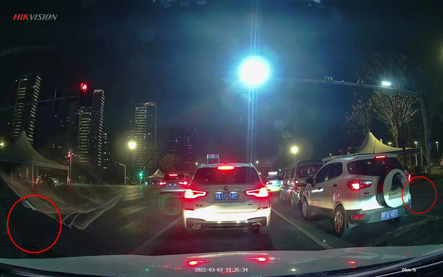 夜间拍摄方面,70迈对于炫光的压制更到位,能清晰的拍下前面以及侧边两车道车辆的车牌号。当然,除了上面已经提到的广角优势外,70迈M500的整个光线布局要略微明亮些,大家可以看上图圈出的红色区域。如果是夜间行驶录制,画质的光线明亮些,相对来说能录制更多细节的。