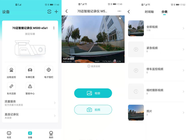 先谈谈70迈的APP,由于此次搭配使用的有4G模组,所以在APP端绑定设备后可以进行远程监控、车辆位置查看、电子围栏使用等功能。