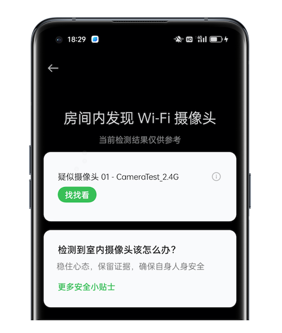 我们通过隐藏摄像头功能的检测,一定程度上缓解了用户酒店住宿时担心被偷拍的担忧,用户只需要拿出适配该功能的OPPO手机,跟着软件界面操作,就能发现潜在的风险。这个方法是不是非常简单有效,如果你手上就有OPPO Find X5系列手机,赶快来试一下吧。