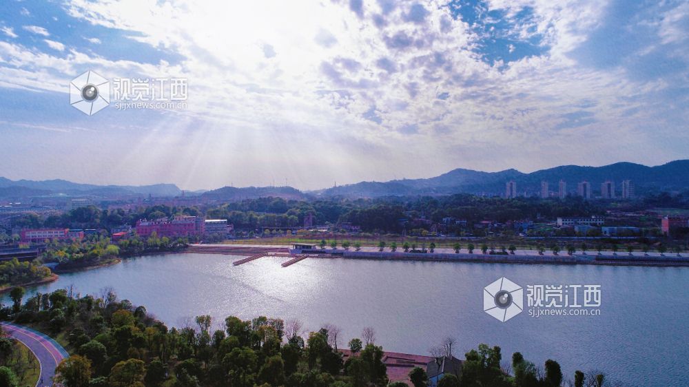 3月9日,无人机拍摄的江西萍水湖湿地公园春景,草木吐翠,亭台楼阁、小桥流水蜿蜒林间,美不胜收。