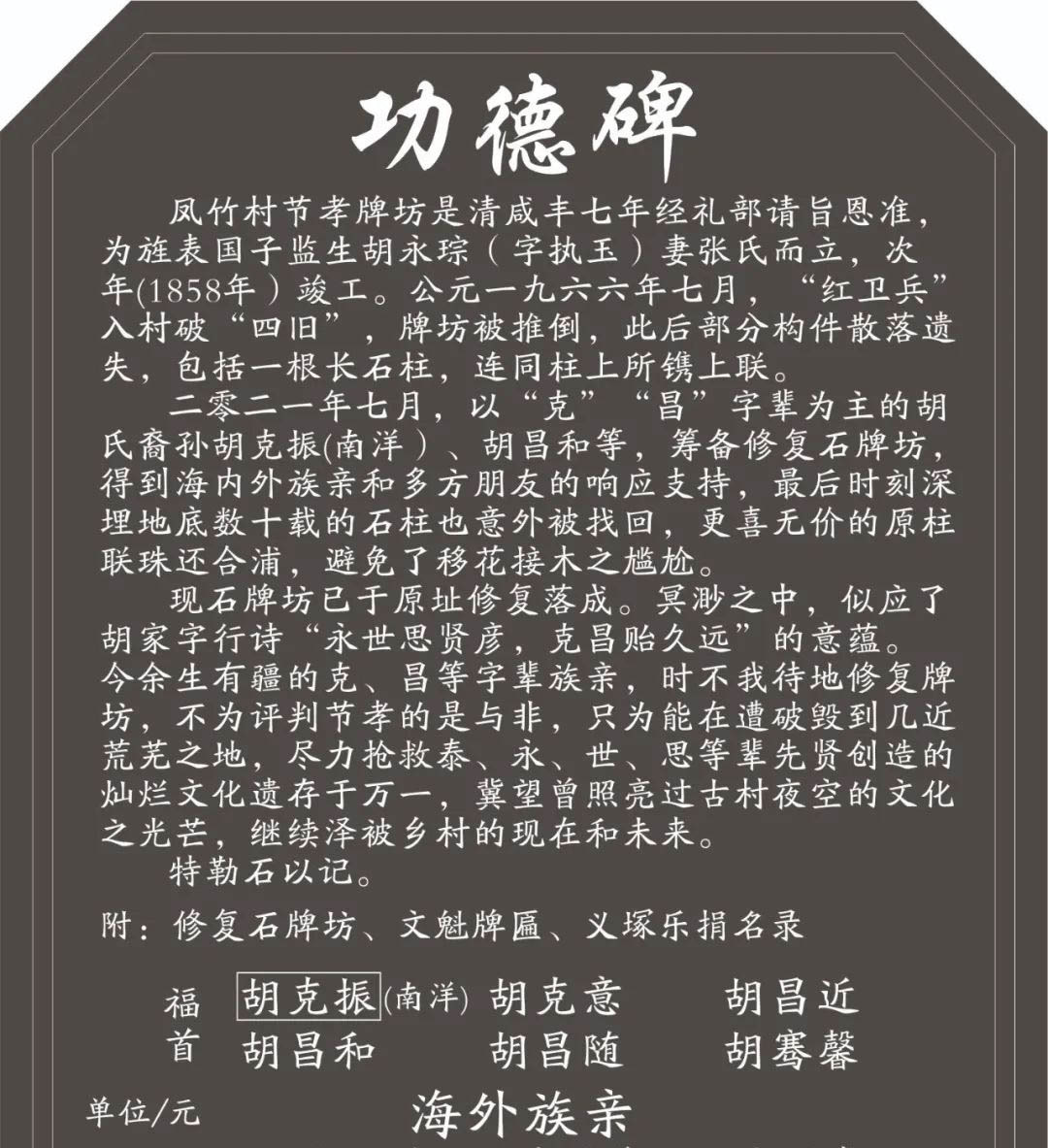 现石牌坊已在原址修复落成,尽管原址周围已经面目全非。冥渺之中,似正应了胡家字行诗“永世思贤彦,克昌贻久远”的意蕴。如今,余生有限的克、昌等字辈族亲,时不我待地修复牌坊,不为评判节孝文化的是与非,只为能在遭破坏到几近荒芜的文化荒漠中,尽力抢救泰、永、世、思等辈先贤创造的灿烂的文化遗存于万一,让后辈通过这些遗迹对村史有更多的了解,同时,冀望曾经照亮过古村落夜空的文化的光芒,继续泽被村庄的现在和未来。