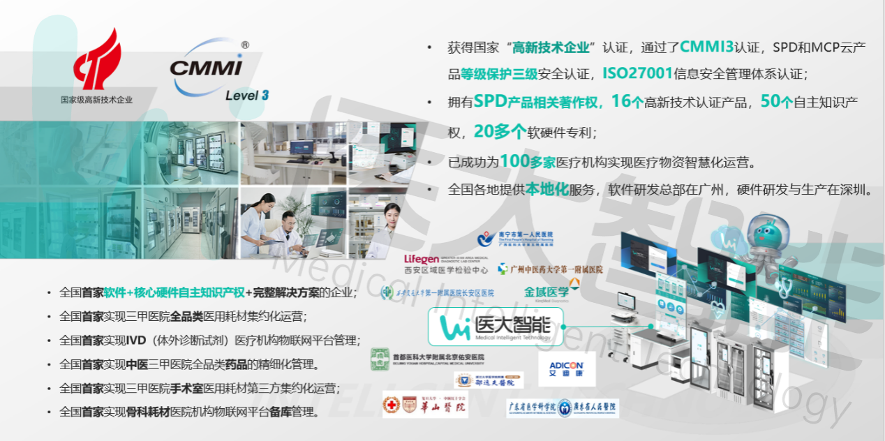 广东医大智能科技有限公司以医疗智慧供应链信息软件、智能硬件、大数据等科学产品的开发与交付的科技企业。企业获得国家“高新技术企业”认证,通过了CMMI3认证,SPD和MCP云产品等级保护三级安全认证,ISO27001信息安全管理体系认证;拥有SPD产品相关著作权,16个高新技术认证产品,50个自主知识产权,20多个软硬件专利,核心产品包括供应链云管理平台,药品、耗材、体外诊断等医院智慧物流软件,一级库、二级库、手术室、医院冷库等物联网工作站,MIT系列智能高值耗材柜、智能冰箱、智能作业车、智能重感管理柜等硬件产品。已成功为100多家医疗机构的药品、耗材、诊断试剂实现智慧化运营管理。
