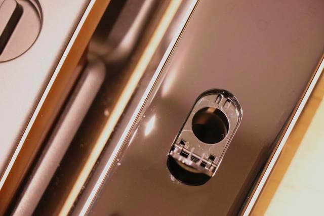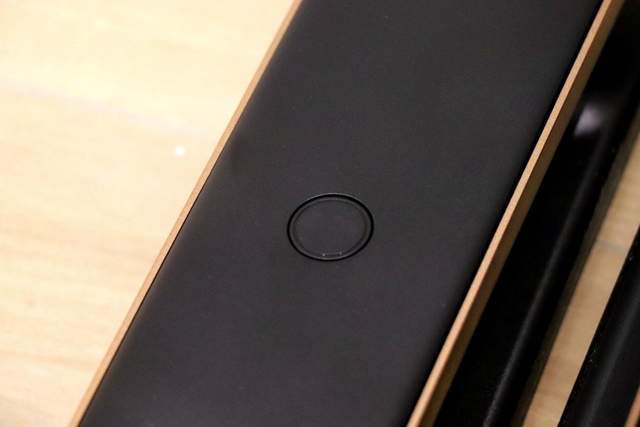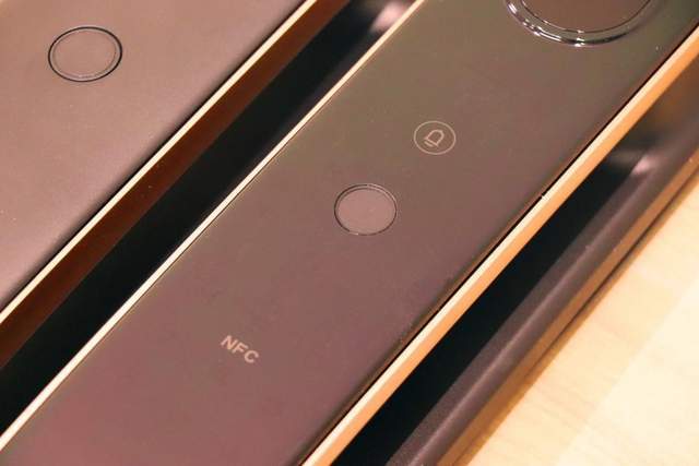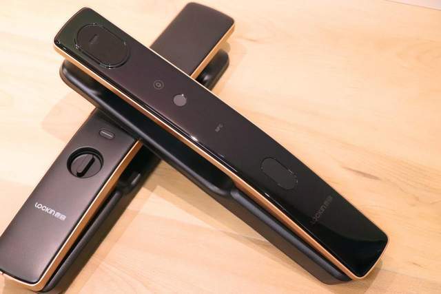 鹿客3D人脸智能锁S50F前后面板均采用铝合金材质,尺寸419*76*73mm。外侧采用了黑色的烤漆盖板,内侧采用了磨砂质感的盖板,加上金色的边框,面板溜背的设计,让锁看上去大气不少。