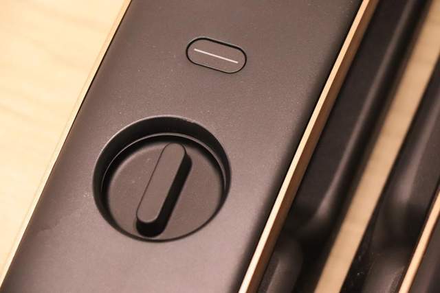 鹿客3D人脸智能锁S50F内侧是8节5号电池仓,即使真没电,在前面板底部还增加了type-c充电口,可以应急充电开门。中间是电子感应区,室内开门需要按按键和把手后感应双重感应才能解锁,这样避免了小孩,宠物误开锁。下面则是智能童锁,当开启后,室内电子开门均失效。旋钮的作用是应急解锁,防止遇到特殊情况,被反锁在家。