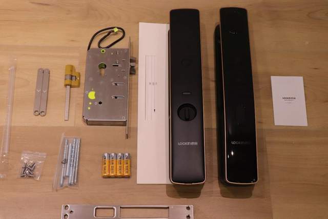 拆开包装就是所有产品配件。分别是前后把手锁体、锁芯、两把机械钥匙、NFC卡、螺丝方棒、八节5号电池、开孔模板、吸管、说明书。为啥配件中会有吸管?客服告知吸管是用来辅助长螺丝窗门时精准定位,螺丝转动时,不会摩擦到门锁的导线,保护外皮不受破损。