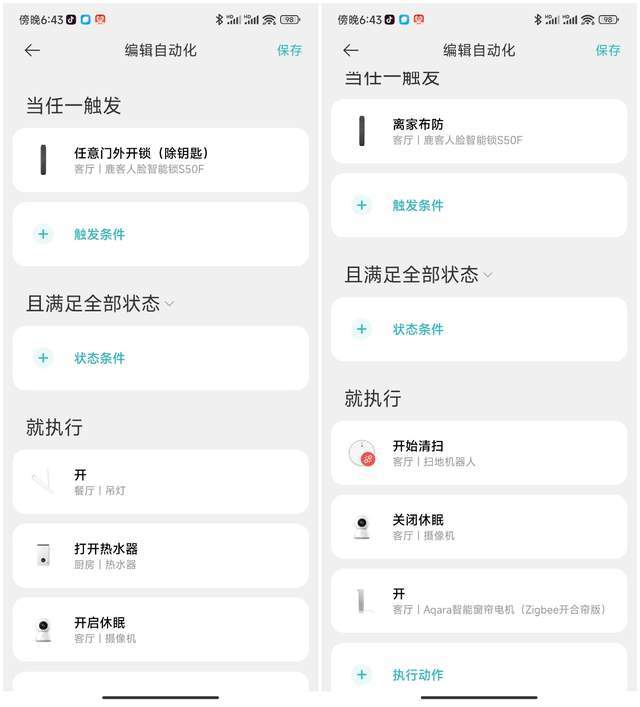 既然指纹锁作为智能家居的入口,那必须可以和家中的米家设备,实现互联。以我家为例,我会结合家中的智能设备,做场景体验。比如开门场景当门打开,自动亮灯,关闭窗帘天然气热水器自动开启,只需在米家APP场景中自定义中,自己设置即可,并更具你的习惯,做一个生效的时间段,这样避免频繁开启场景影响体验。出门场景,我一般会设置窗帘开启,家中所有不用的设备自动关闭,扫地机自动开启,摄像机自动开启。对于家中有几口人的情况下,建议把离家布防设置为必备条件,当家中最后一个人走时,按上前面板上的钥匙键,才能执行离家布防模式,这样就不怕出门但家中有人,却自动执行离家模式,只要家中米家设备多,可玩性会非常棒!