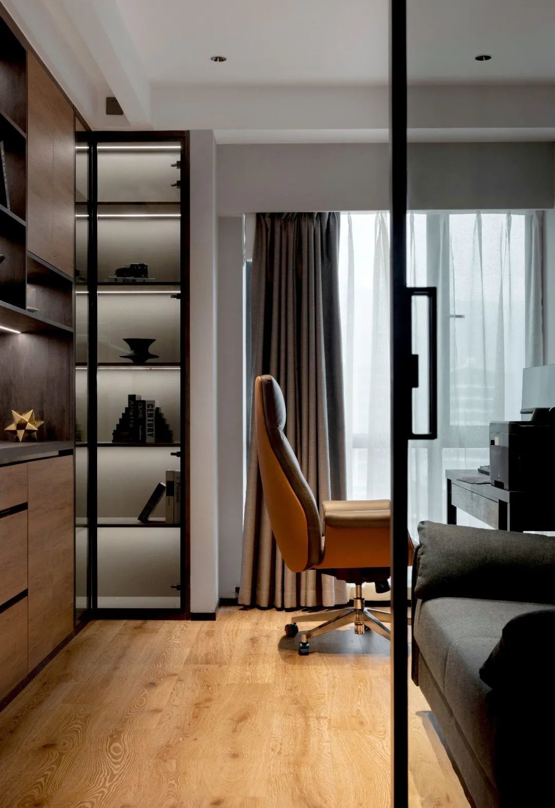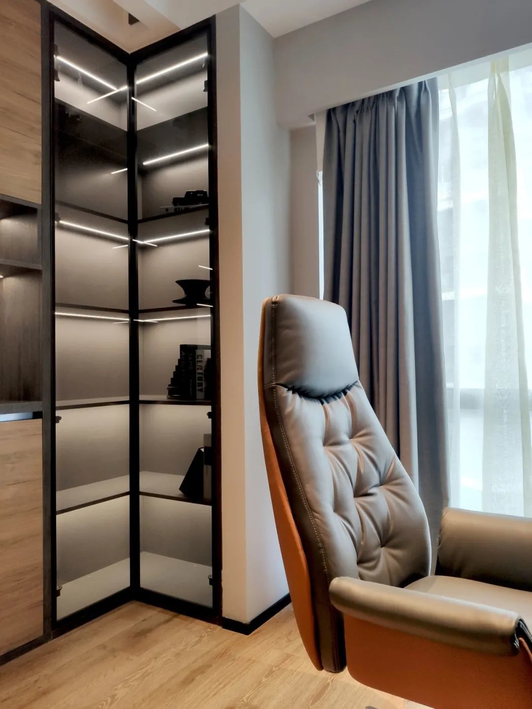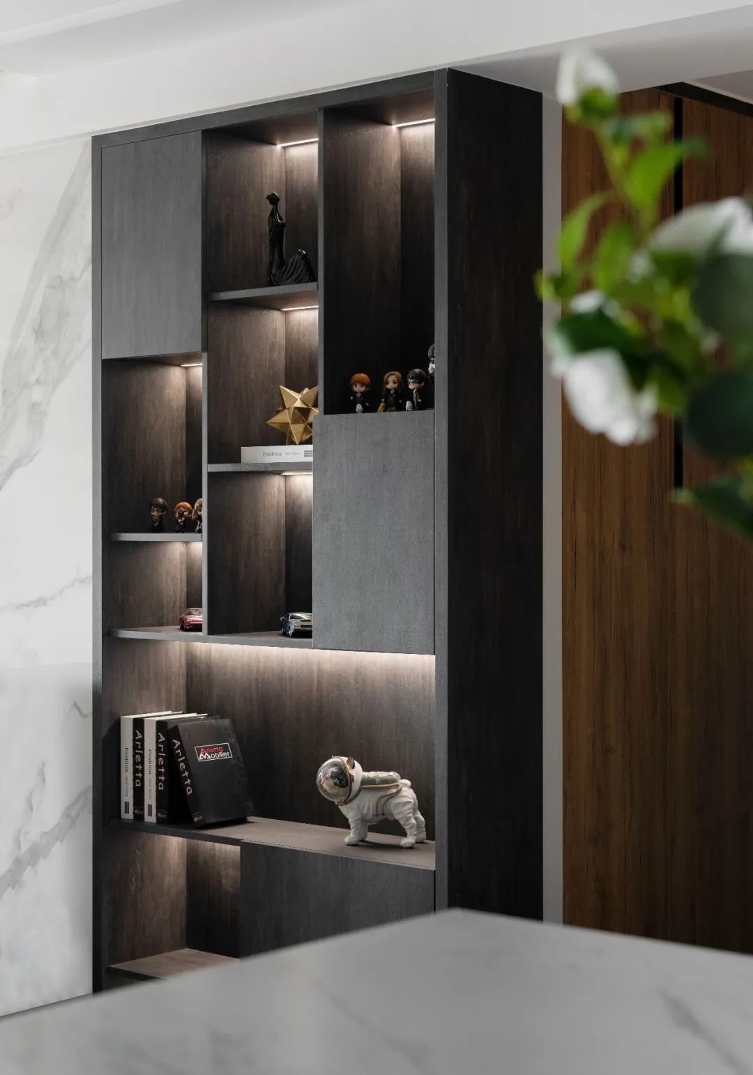 为满足屋主客厅收纳、展示的需求,在电视墙右侧,设计师还定制了一处通顶柜体,灰色的柜体搭配内部的灯带,用来陈列各种书籍、藏品、手办,再适合不过。