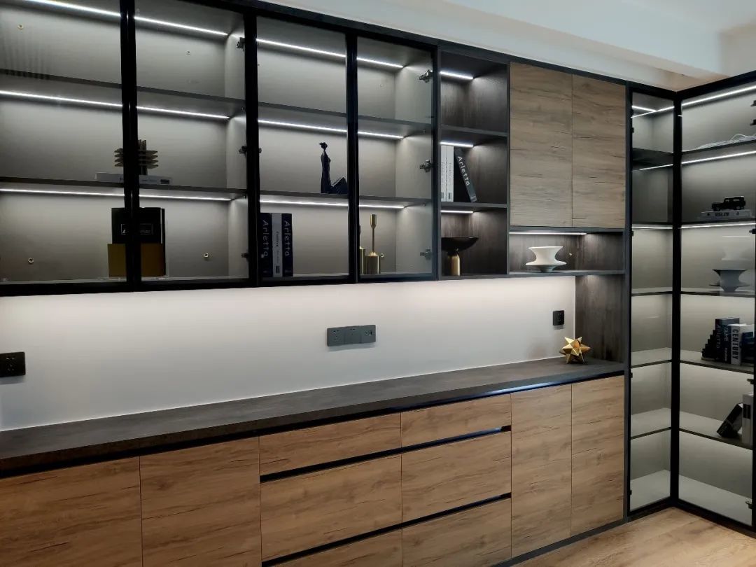 转角处直接做成了两列透明柜门的收纳柜,加上了灯带,让空间显大。