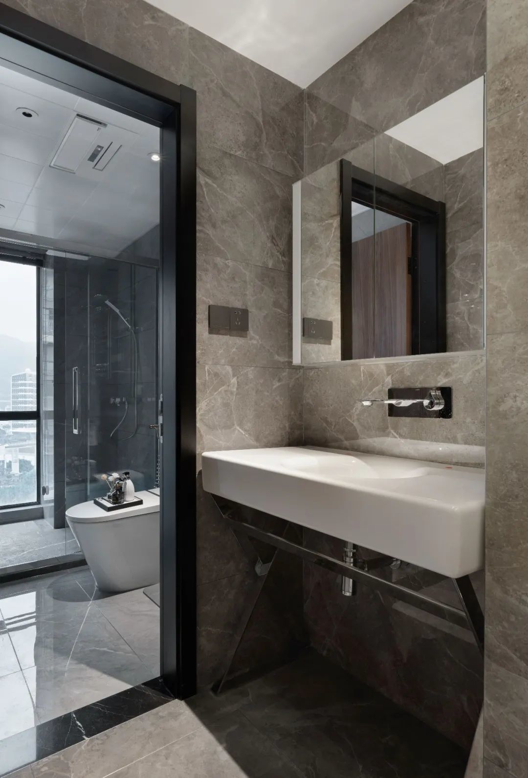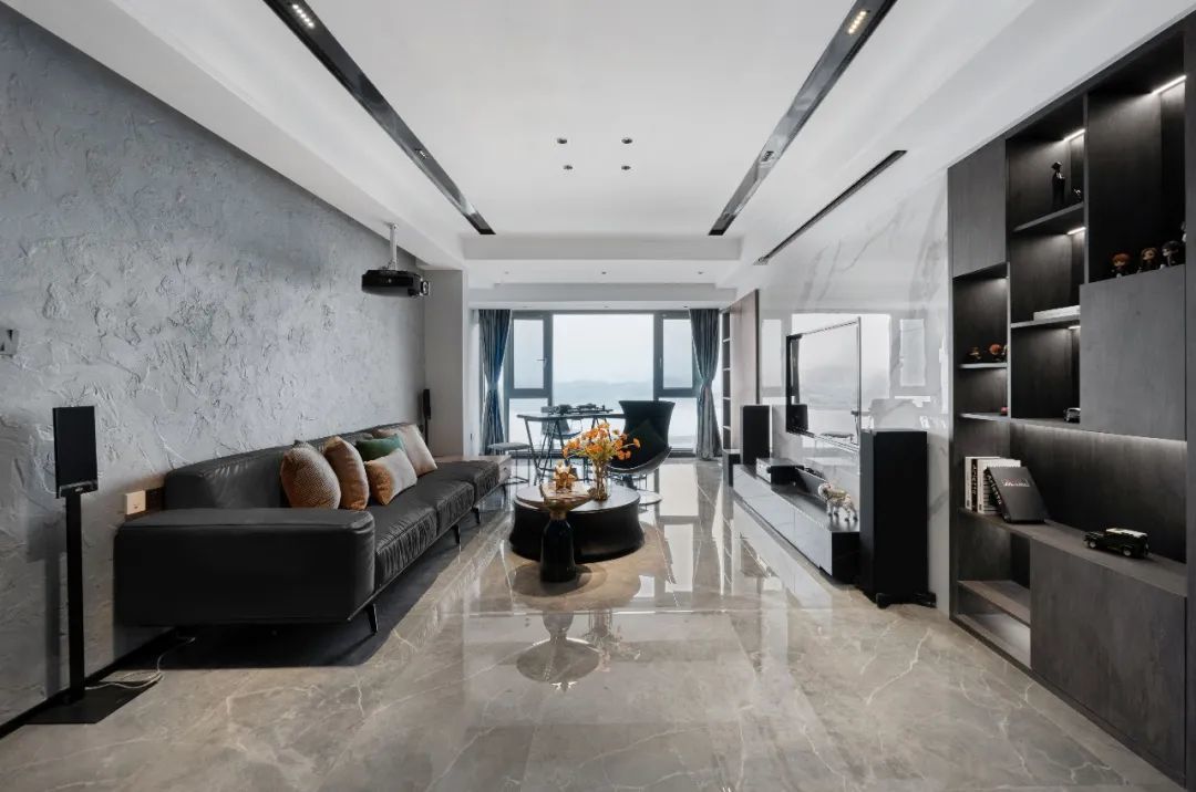 整面沙发墙都采用了石料的不规则毛边,随性的纹路增加了质感,也让整面灰色的墙并不会显得沉重,反而与雅致轻奢的大理石电视墙相映,调和出客厅空间别具一格的腔调。