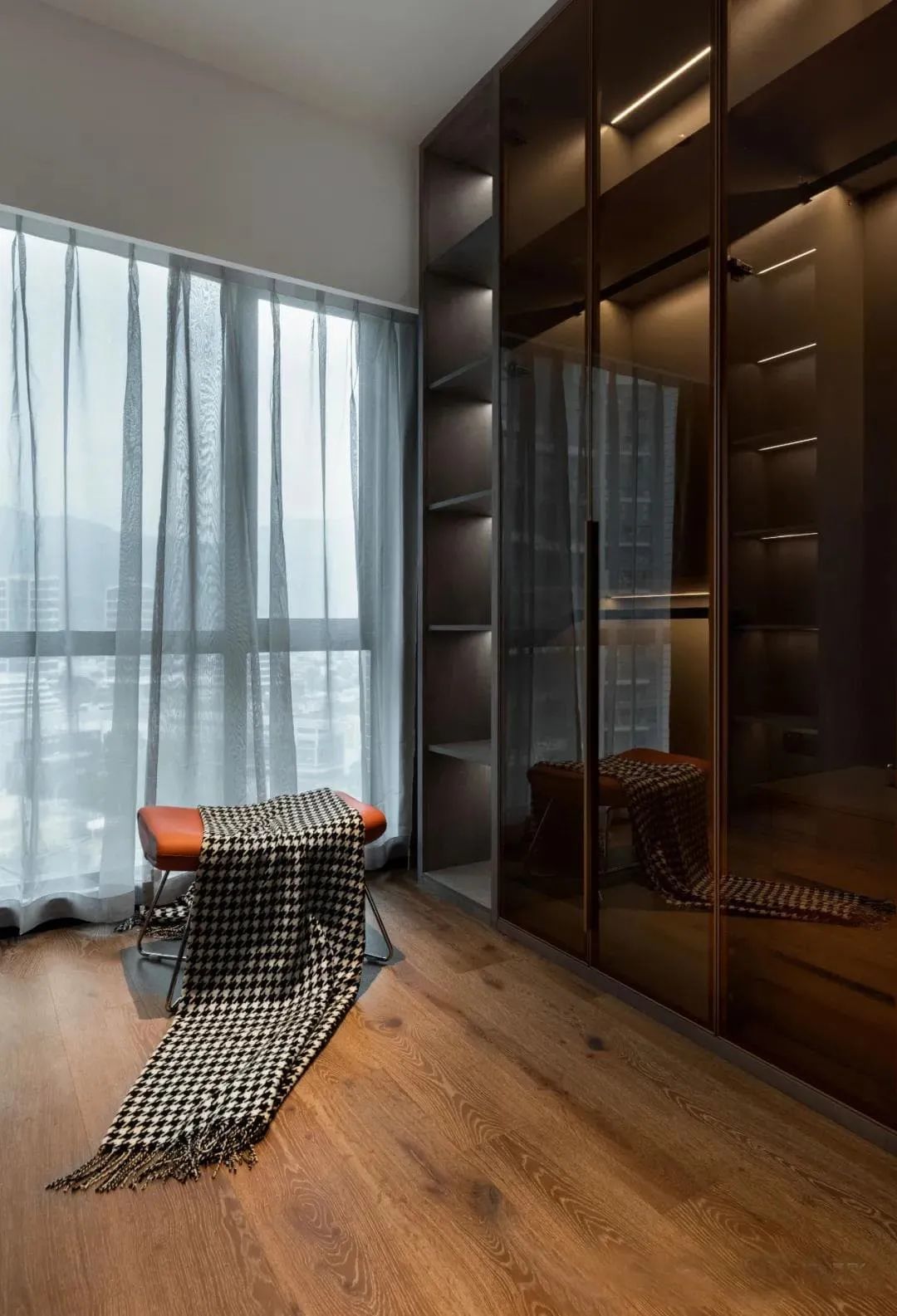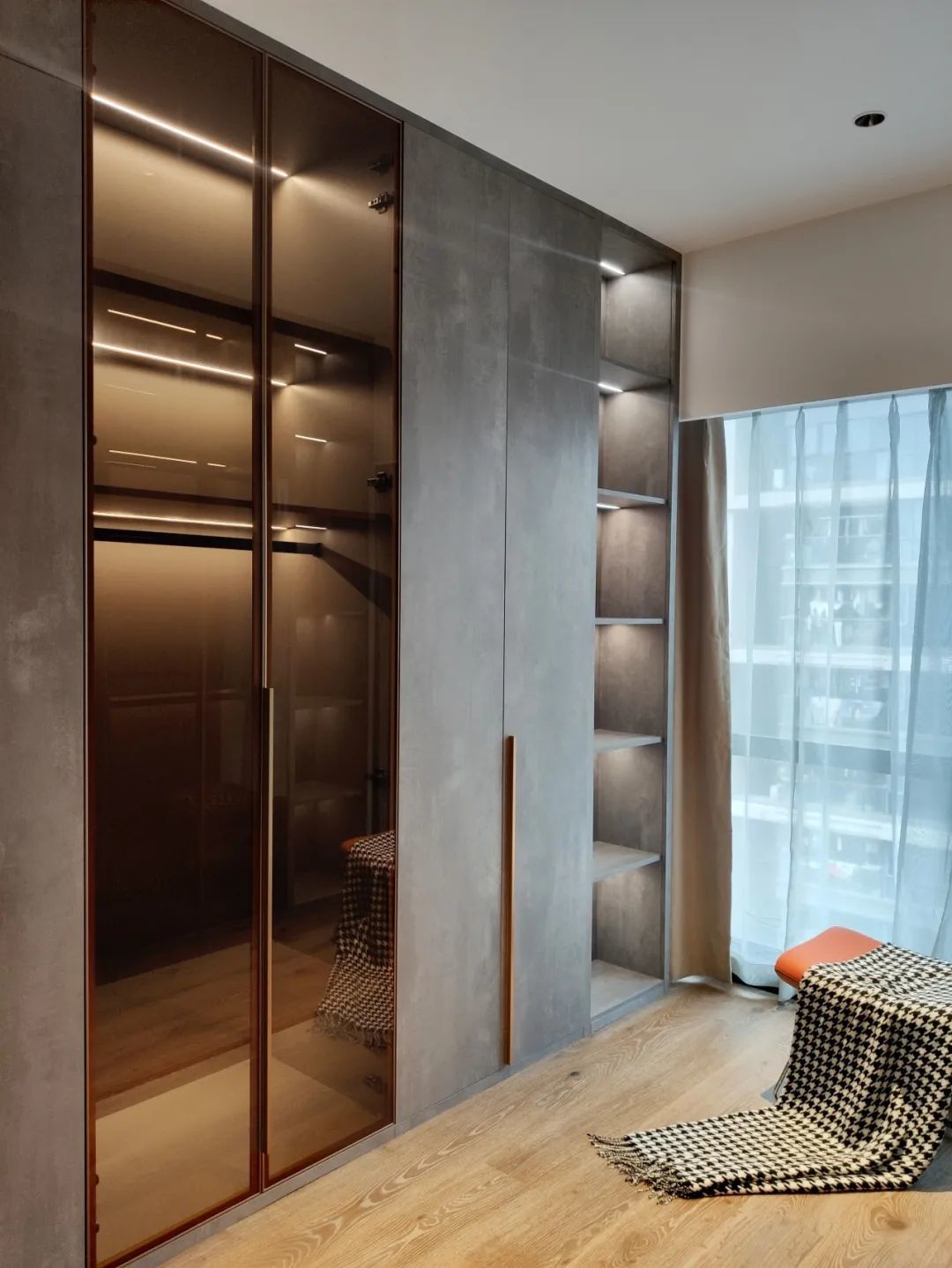 衣帽间打造了三面柜体,充分满足了收纳所需,加上灯带的配置,展示性也立刻拉满。