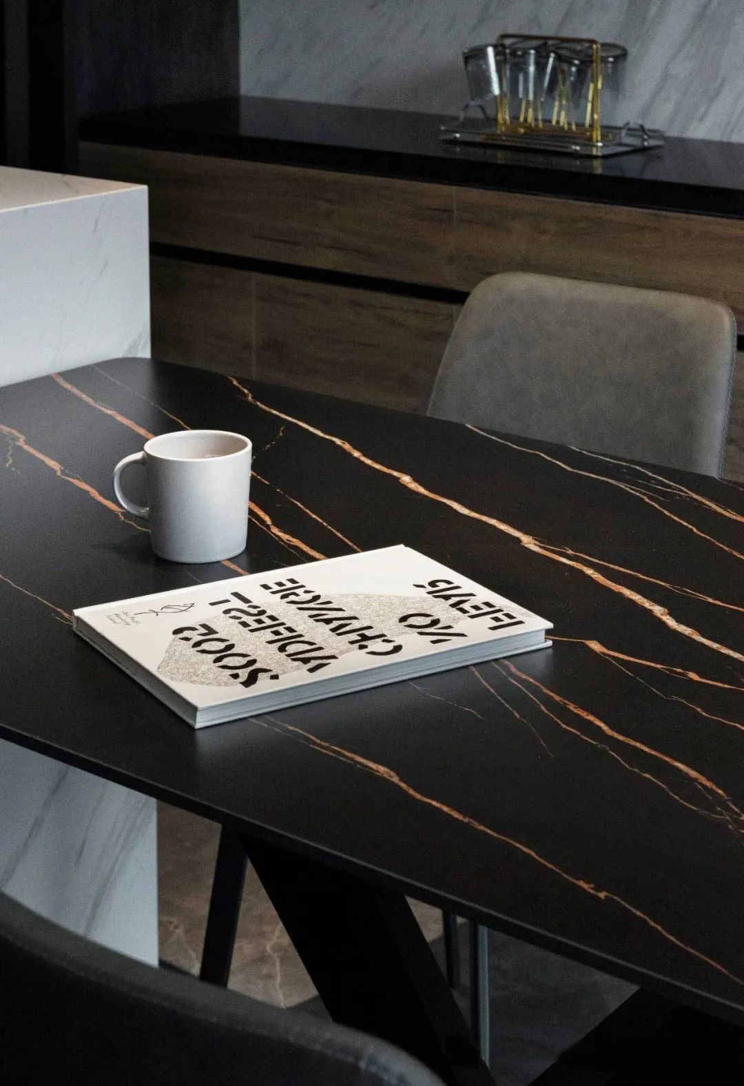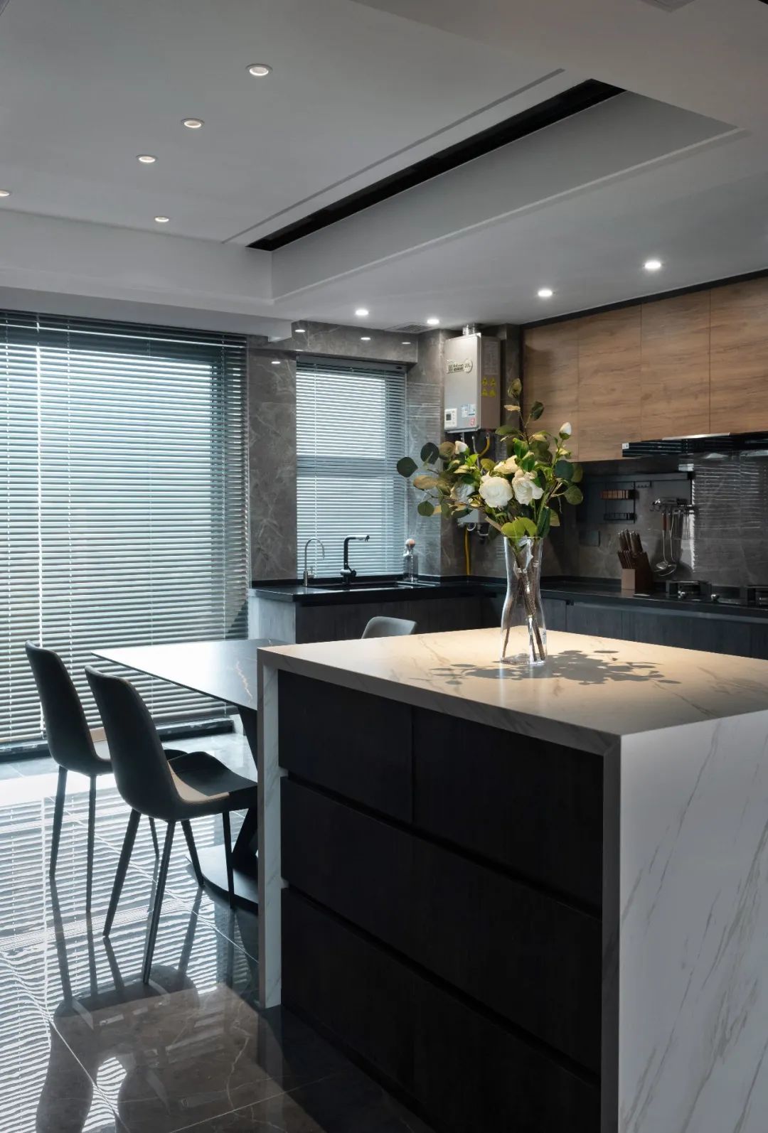 和岛台相连的餐桌选用深色,彼此搭配,让就餐空间更有氛围。