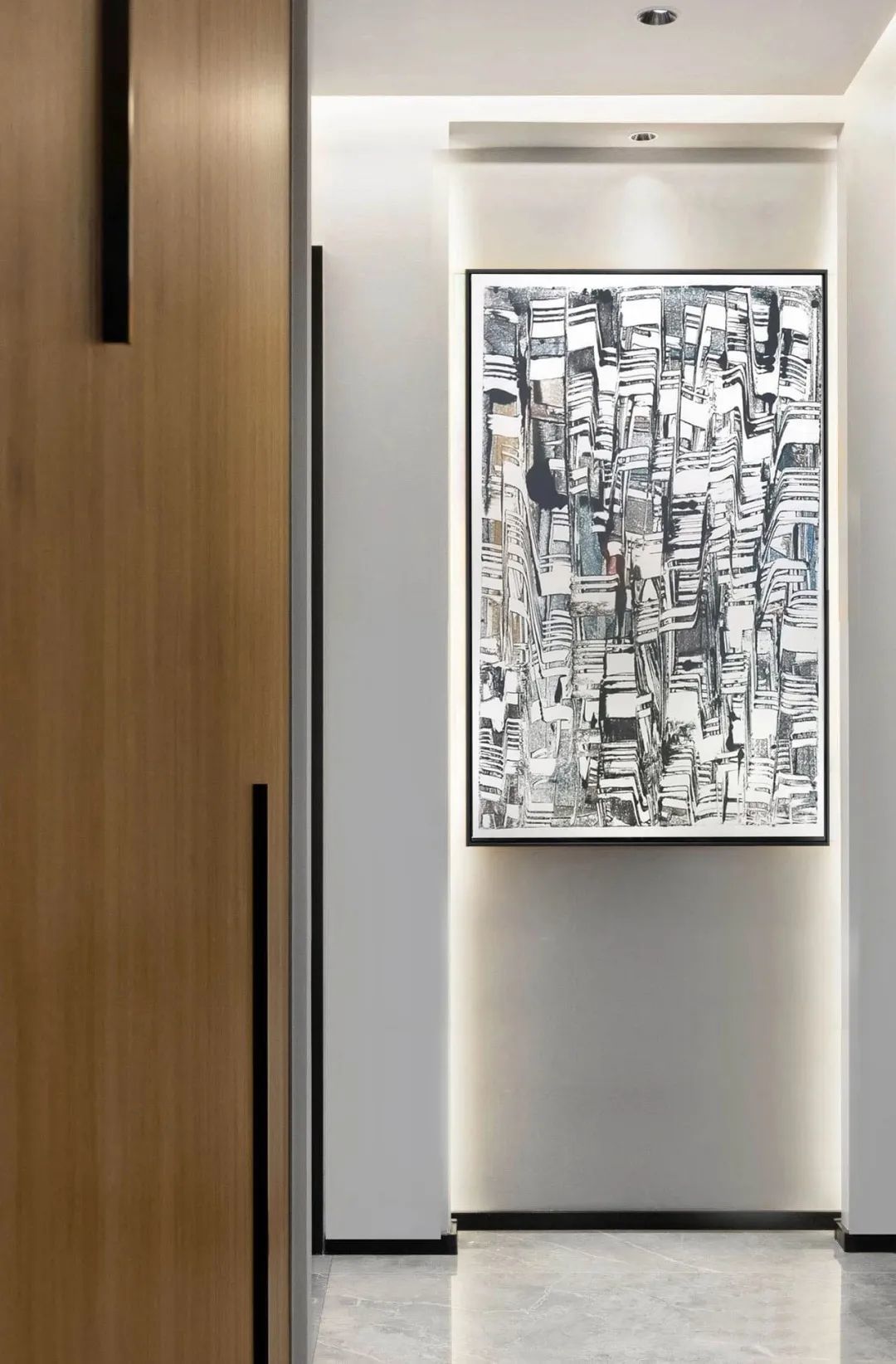 这处空白正对入户门,既是室内空间的留白,也给了设计师发挥的空间:用灯光、挂画造景,解决了过道单调的问题,增加了空间的艺术感,让人一进门,就能感受到屋主的品位。