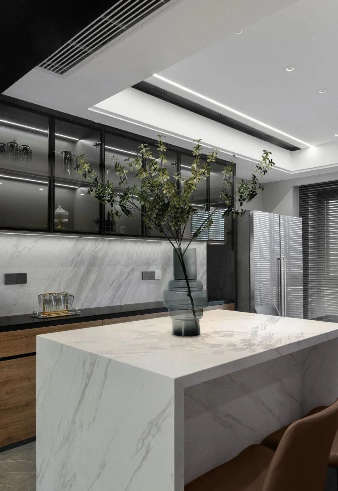 无主灯设计则从顶面着手,合理搭配筒灯、线性灯,避免繁复,让整个空间更加规整简洁。