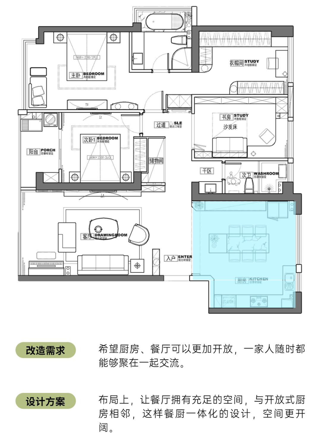 在客厅一旁,是“扩容”后的餐厅和厨房。