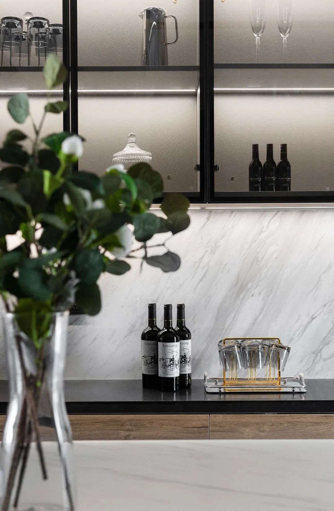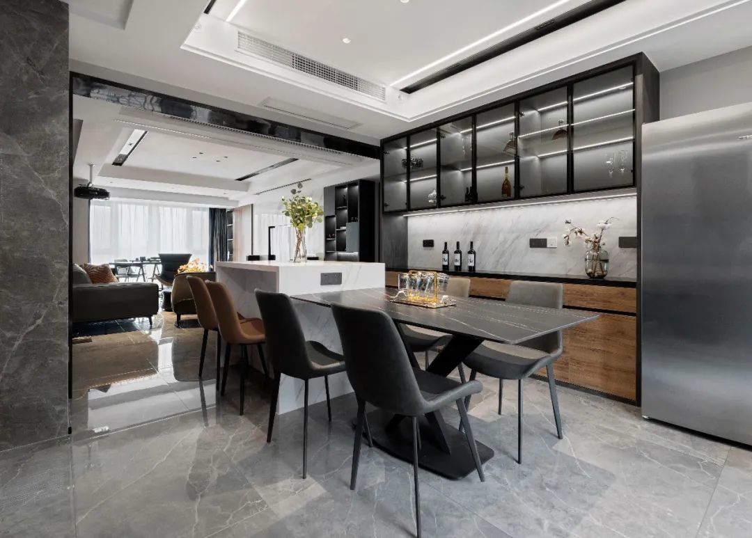 和客厅同样,这里也一样是无主灯的设计,根据餐厅的实际生活场景,设计师对灯光做了更加细致的布置,让灯光洒下来时,予以美食美酒绝佳的氛围。