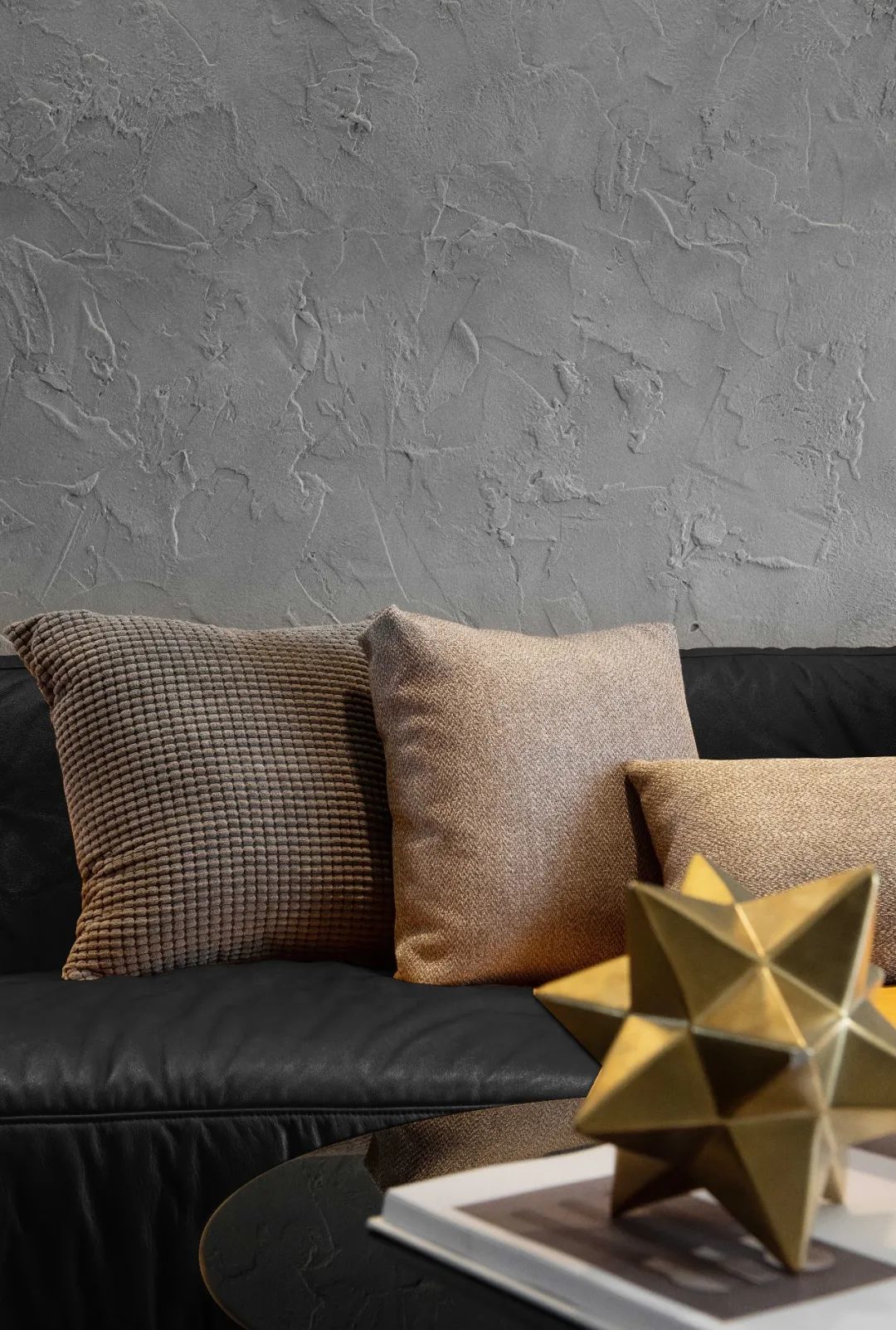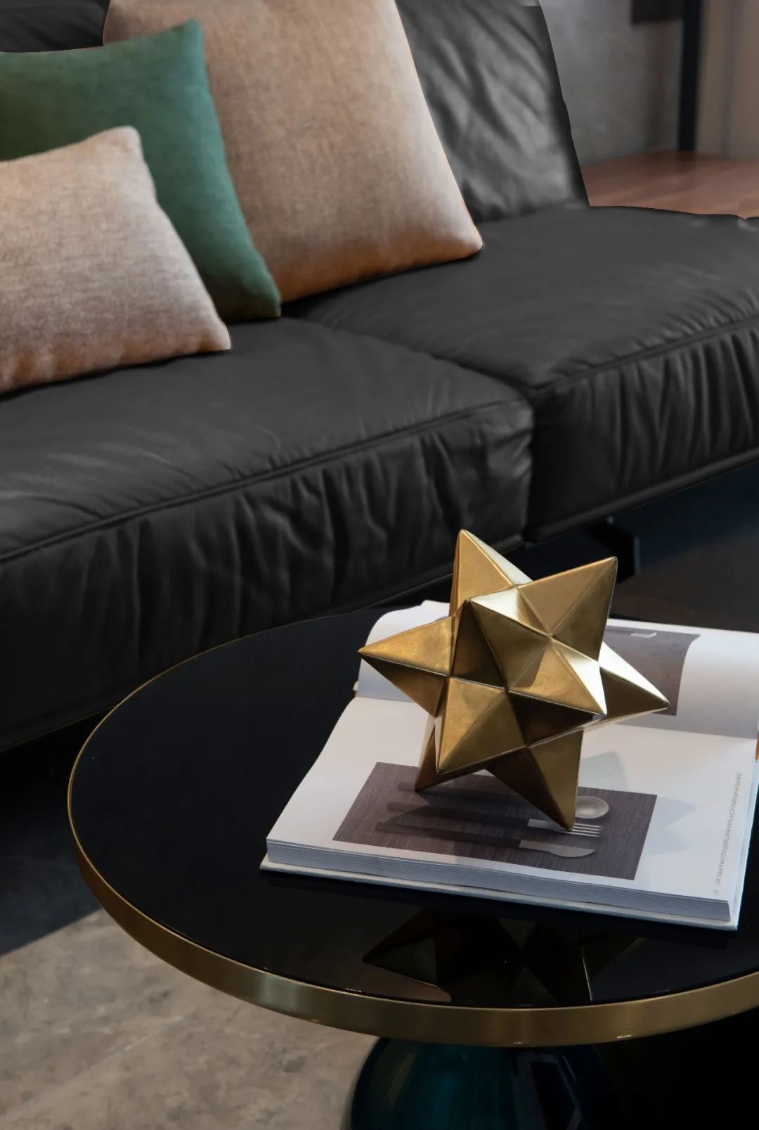 软装方面,沙发选用黑色,搭配同色金边的茶几,让客厅有了一处柔软舒适的重心。