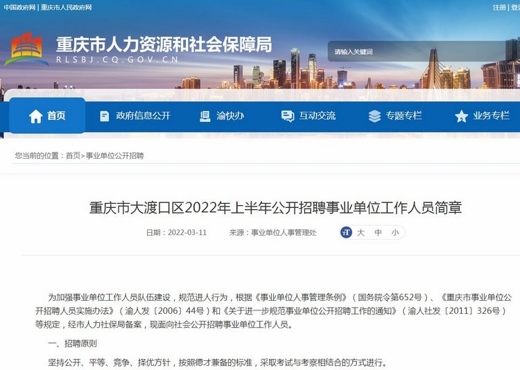 3月11日,重庆市人力资源和社会保障局官网发布消息,大渡口区2022年上半年将面向社会公开招聘事业单位工作人员21名,网上报名时间为2022年3月21日9时30分至3月23日17时。