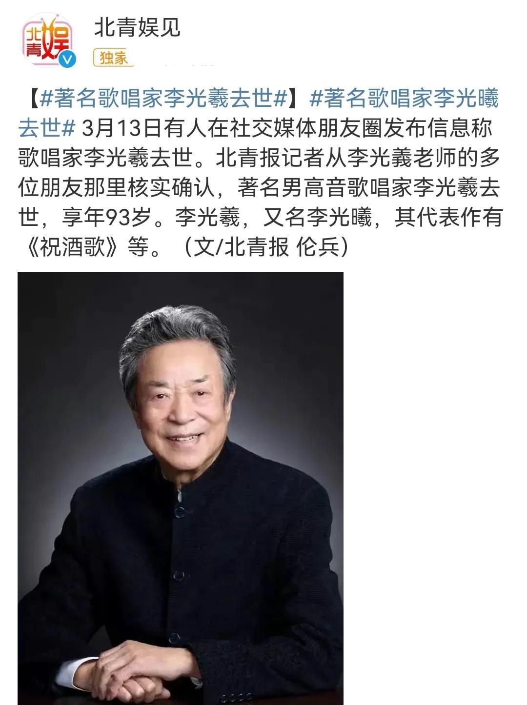 3月13日晚上,一则悲痛的消息传来。著名男高音歌唱家李光曦老师因病去世,享年93岁。