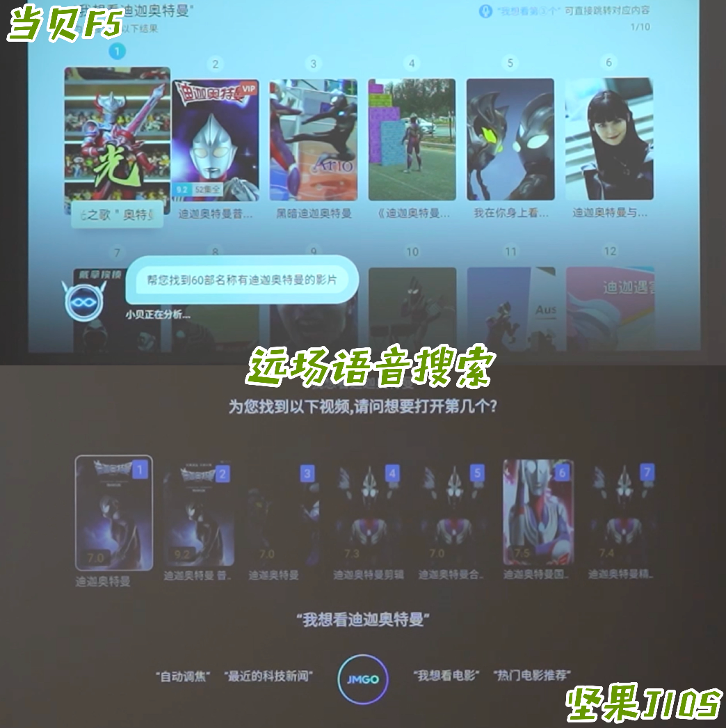 上文说到这两款投影仪都有四孔拾音,那是为远场语音所准备的,在体验两者的远场语音功能之后,当贝凭借着与影视资源强大的搭配合作更令我心水,在内容展示上也出现了更多相关内容,坚果J10S就受到了内容源上的局限。