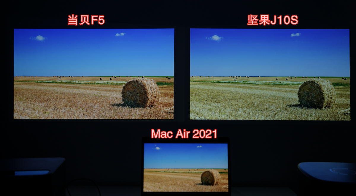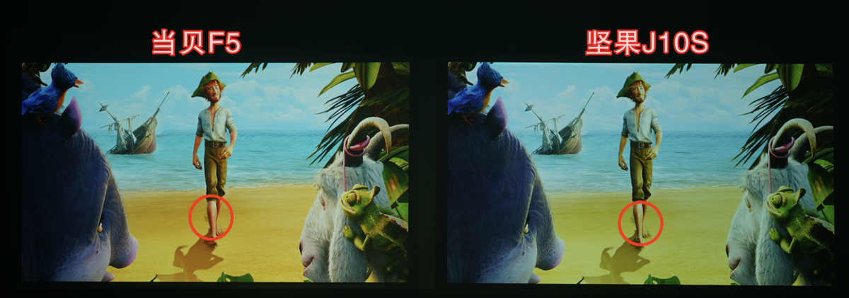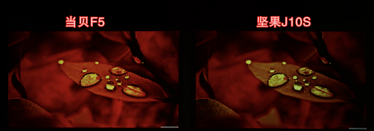 从这张对比图我们可以看出右下角画面的明暗表现与明暗过渡之间有所不同。当贝F5把背景细节刻画的比较清晰,细节也没有模糊的情况产生,而坚果J10S的画面则糊成了一团。