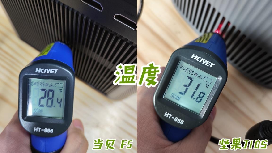 ②在开机后测量的温度值上,坚果J10S的温度值更高。
