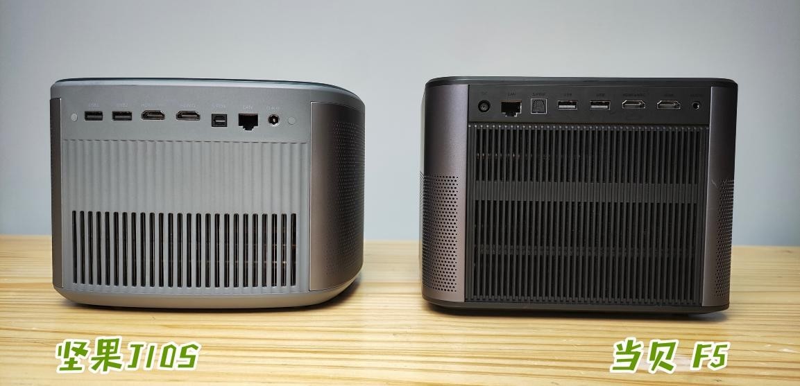 在机身背部,我们可以看到这两款投影仪在设计上都中规中矩,接口也十分一直,因为芯片的原因,它们采用的都是双USB2.0接口,不过在HDMI接口上还是有所不同,当贝F5其中的一个HDMI为eARC接口,坚果J10S还是使用的ARC。不过就散热口的面积来看,当贝F5的散热栅格面积更大,让机器更与效率的实现散热。