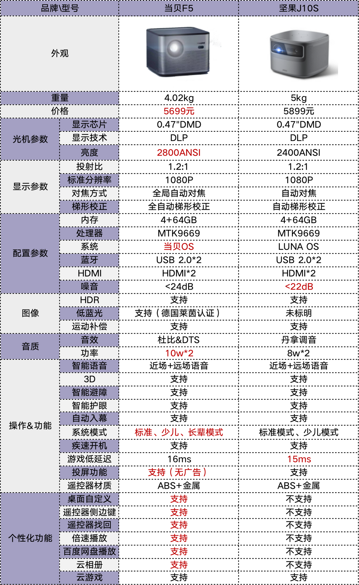 从参数配置表来看,这两款投影仪差距不大,因为都采用MTK9669芯片的原因,在性能上差异不大,不过考虑到亮度和其他辅助功能的体验上,我相信当贝F5的综合能力会更强劲一些。