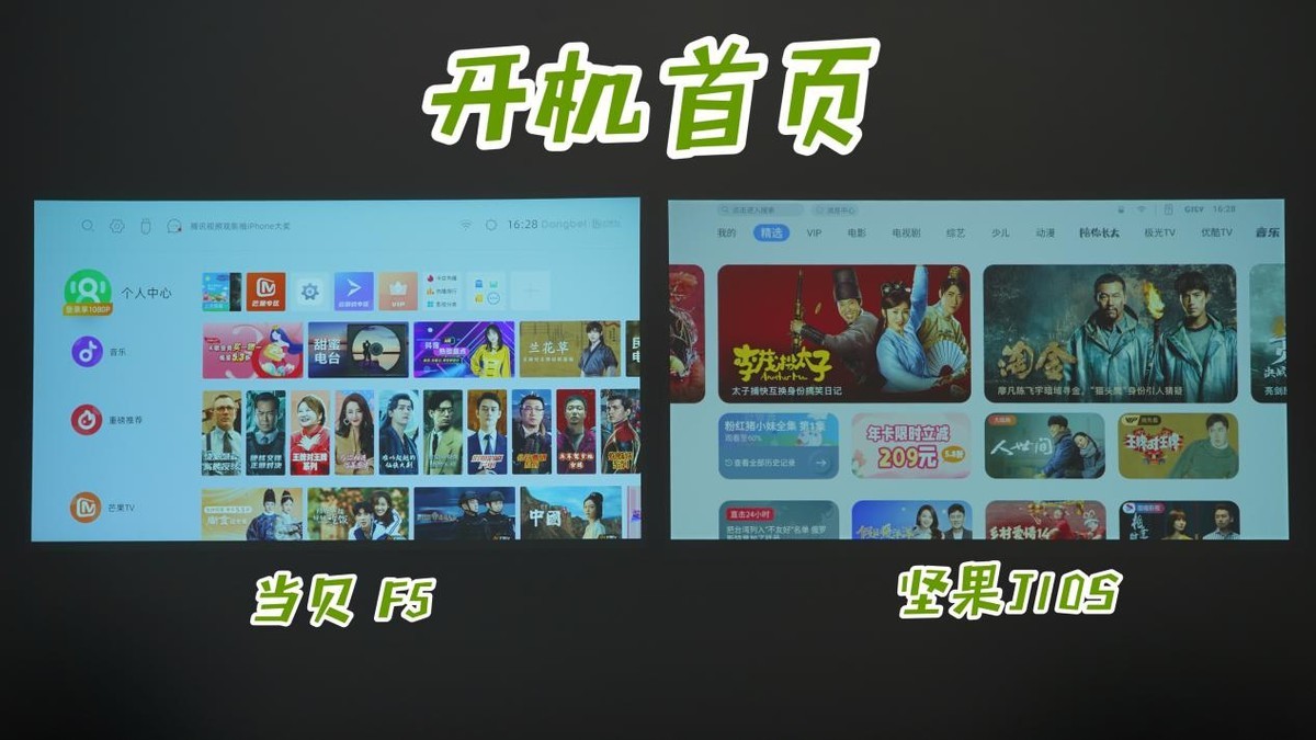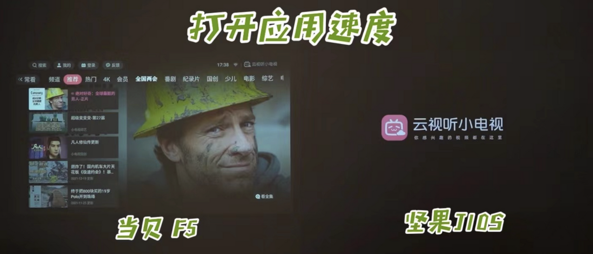 在软件运行上,坚果J10S的软件开启速度要慢于当贝F5,当贝F5已经唤出应用界面了,坚果J10S还停留在开屏loading。