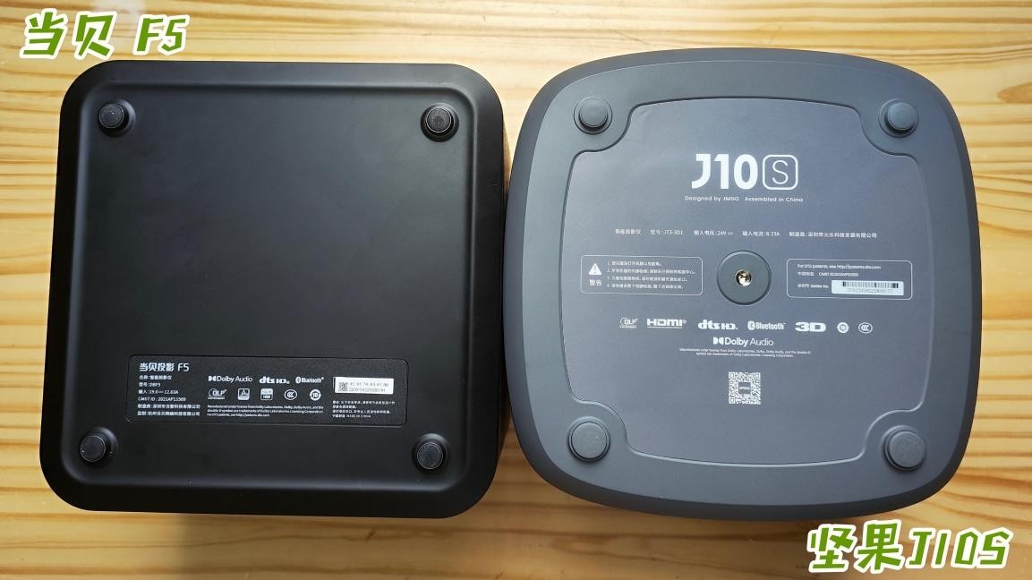 从整体上来看,这两款投影仪在体积上相差不大。两款投影仪在机身正面都添加了品牌的logo,增加辨识度,镜头也都设置在左上方,对焦感知模块也放置在镜头的右侧。从外观的设计感来说,坚果J10S在外观上包裹感更强,当贝F5的设计更为轻盈,周边也做了大面积的散射蜂窝孔处理。