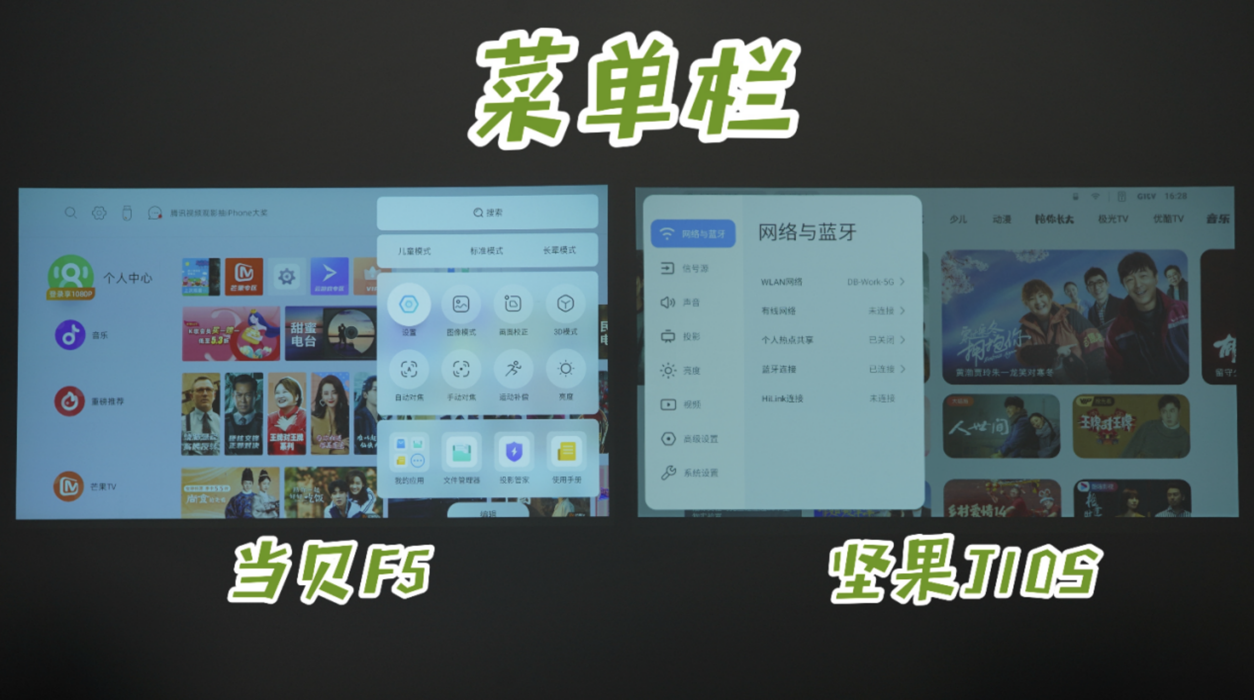 开机后两款投影展示的主页界面上,当贝为左右两侧的分栏设计;坚果为上下两侧的分栏设计。在菜单展示上,当贝的相对简洁明了,坚果的比较紧凑。