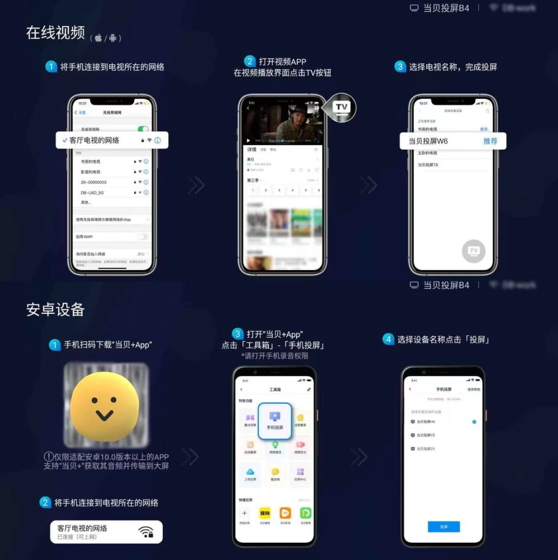 像如今许多投影用户都会使用投屏功能来观看视频,这两款投影仪都可支持无线投屏,坚果J10S在投屏前需要观看一段广告;而当贝自研的当贝投屏让用户减少了等待成本,软件起家的当贝有着先天优势,无需花长时间观看广告,一点投屏就能马上进入。