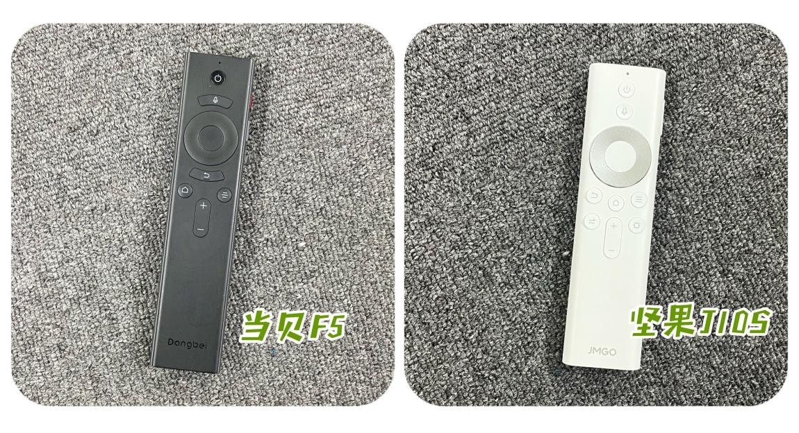 说外外观现在让我们一起来看看操作部件——遥控器,这次在遥控器的对比上,坚果J10S完全败下阵来,虽然两款遥控都有侧边键,但是当贝F5的侧边键功能更多,设置了两个功能按钮,有针对性的操作投影。在触感上,这两款遥控器也十分不同,当贝F5采用ABS+金属的复合材料,贴合手掌符合人体工学;坚果J10S则沿用了上一代坚果J10的遥控,整体为ABS包材,部分为金属按键。