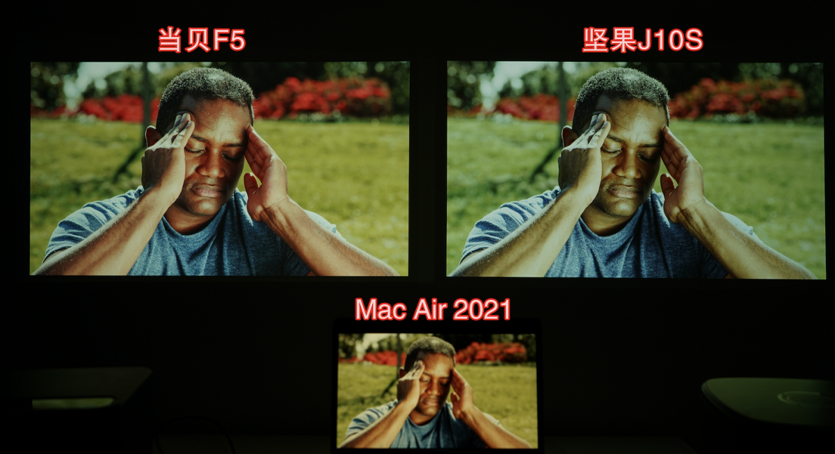 从人物的肤色才看,大家就知道哪款投影仪的人脸还原更高,坚果J10S所呈现的人像更为蜡黄,当贝F5的更为红润;同时坚果J10S人像上的浅部区域明暗过渡不够分明,看似曝光,人像身后的红色景物上,坚果J10S的画面会有发虚的情况产生,只能展示近景效果。