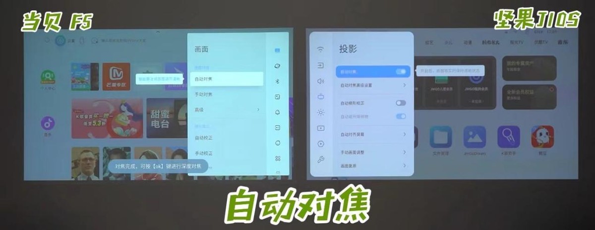 就自动对焦功能来说,个人体验下来,当贝的自动对焦更方便,当贝F5采用的是深度对焦方式,增加了一层对焦算法,使对焦后更方正清晰且画面边缘更锐利。