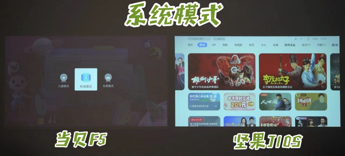 在操作系统上,当贝F5采用的是自研的当贝OS系统,坚果J10S采用的是LUNA OS系统。这两款系统的主要区别就在于展示方式不同。