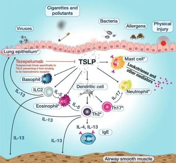 TSLP是一种针对促炎性刺激(例如肺内过敏原、病毒及其他病原体)产生的上皮细胞因子,在气道炎症的发生和持续中起着关键作用。TSLP驱动下游T2细胞因子的释放,包括IL-4、IL-5和IL-13,导致炎症和哮喘症状。TSLP也能激活参与非T2驱动炎症的多种类型细胞。因此,TSLP在炎症级联反应的早期上游活动已被确定为在广泛哮喘患者群体中的一个潜在靶点。阻断TSLP可阻止免疫细胞释放促炎细胞因子,从而预防哮喘恶化、改善哮喘控制。