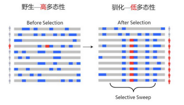 自然选择促使有利突变在群体中保留下来,与之连锁的中性位点突变频率提升,非连锁的中性位点突变频率下降;简单的说就是基因组某区域由于受到了选择而消除多态性,即遗传多样性降低,在群体中出现高频的等位基因和低频的等位基因。