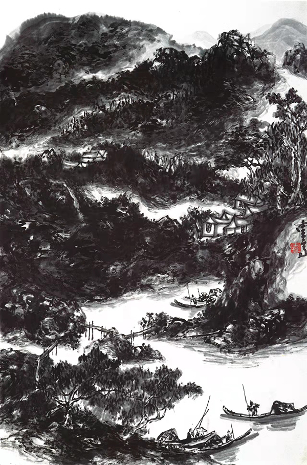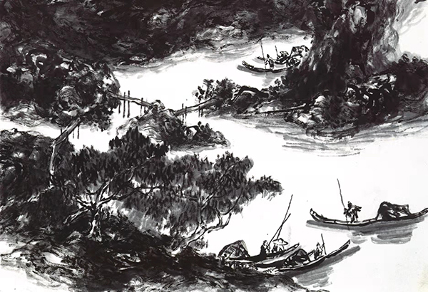 这情景颇似《斜江摇渡》画面中所描绘的。在画作的下方,几个微小的人物则是整幅画最引人入胜的部分。这些精彩的人物造型,虽然其比例小得几乎看不清五官,但通过人物的剪影与形态,一眼便可以看出鲜活的人物特征,年龄性格似乎也可一目了然。这些生动的形象仿佛是画面的眼睛,给整个作品平添了浓郁厚重的人文气息。