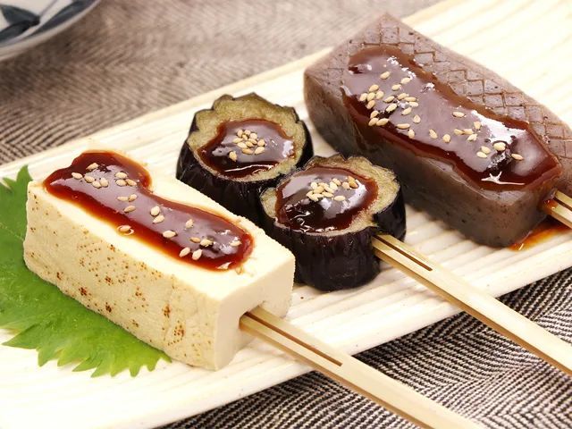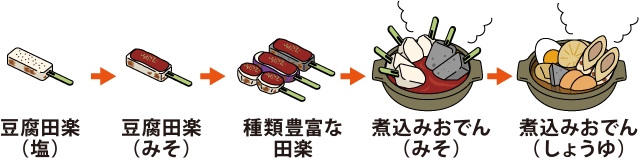 到了江户时代,酱油酿造技术从关西传到了关东,所以在关东地区,田乐进一步演变成用酱油、柴鱼片、味淋等调料调制的汤汁中放入串好的食材煮制的料理。