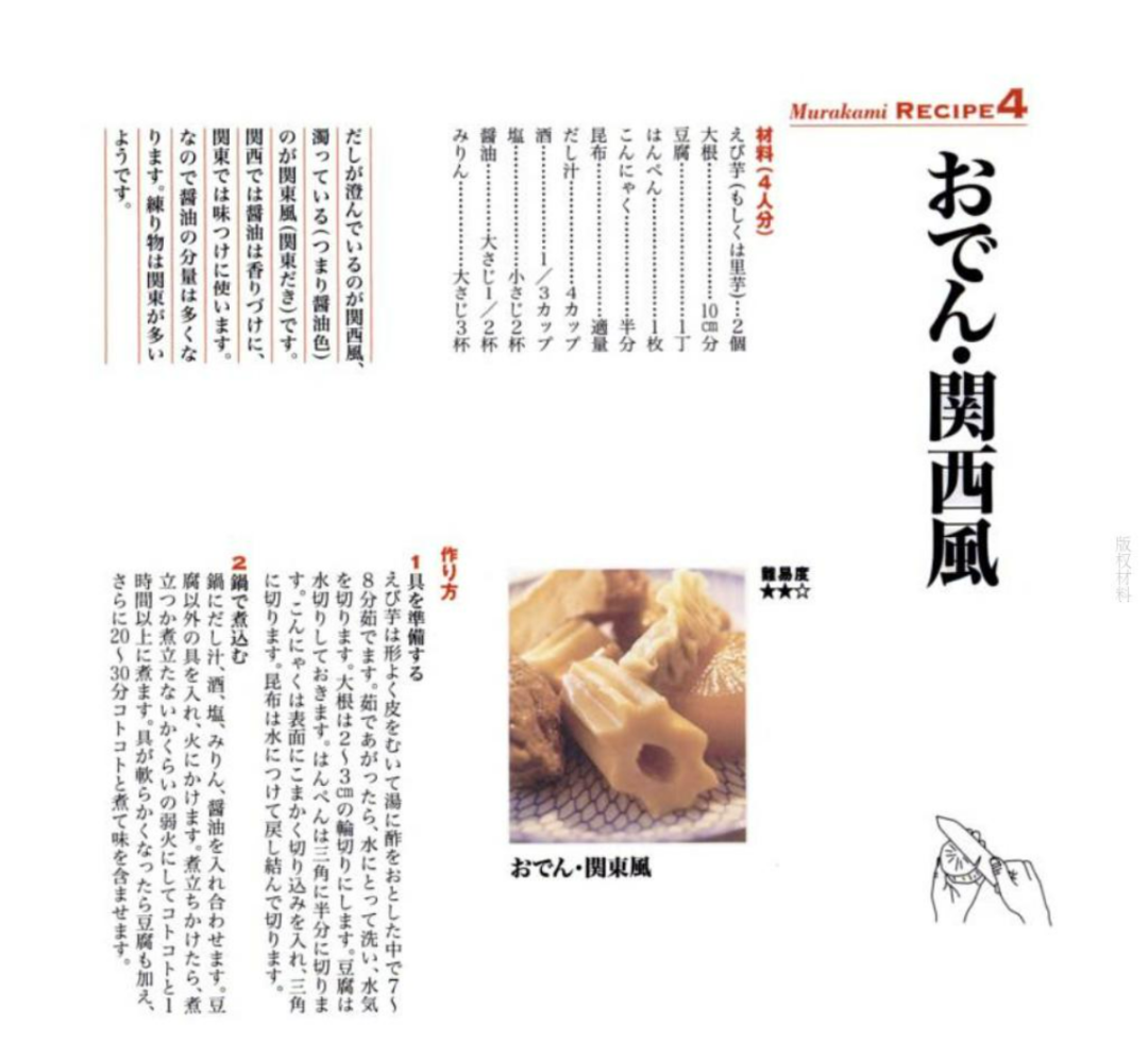 日本知名诺贝尔陪跑作家村上春树是关西人,有一本关于他的料理书里介绍过,“汤汁清澈的是关西风,汤汁浑浊(也就是酱油色)的是关东风(关东煮), 在关西,酱油只是用来增香,而在关东,酱油是用来调味,所以使用酱油的分量会更多。”