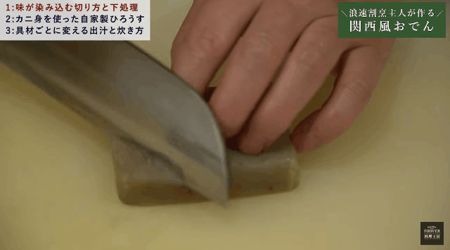 真正的关东煮绝对不是煮半成品那么简单,不仅很多都需要手工制作,一些看似很天然只需切分的食材,也是需要经过预处理才能达到最佳的口感。