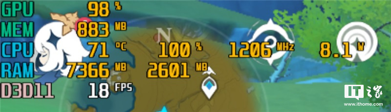▼ 此时的温度已经达到 71°,并且在后续持续运行过程中没有上升,CPU 频率也大概在 1200 MHz 上下浮动,帧率稳定在 18 FPS 左右,不打架的话,还是可以玩的。